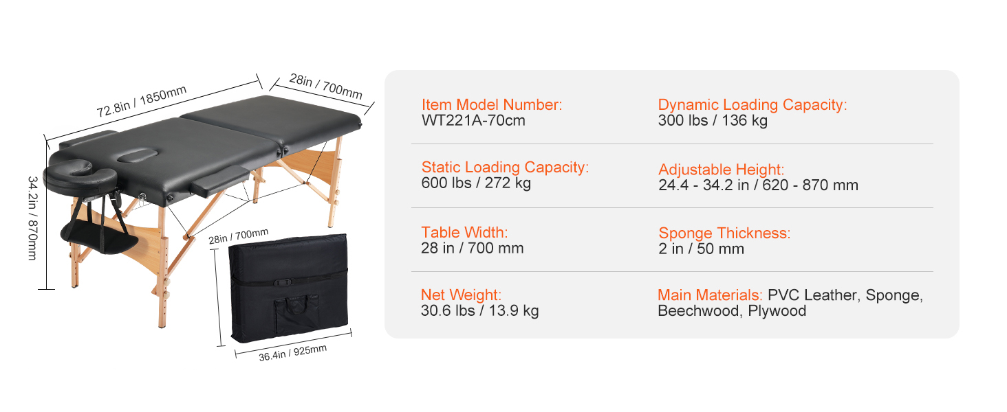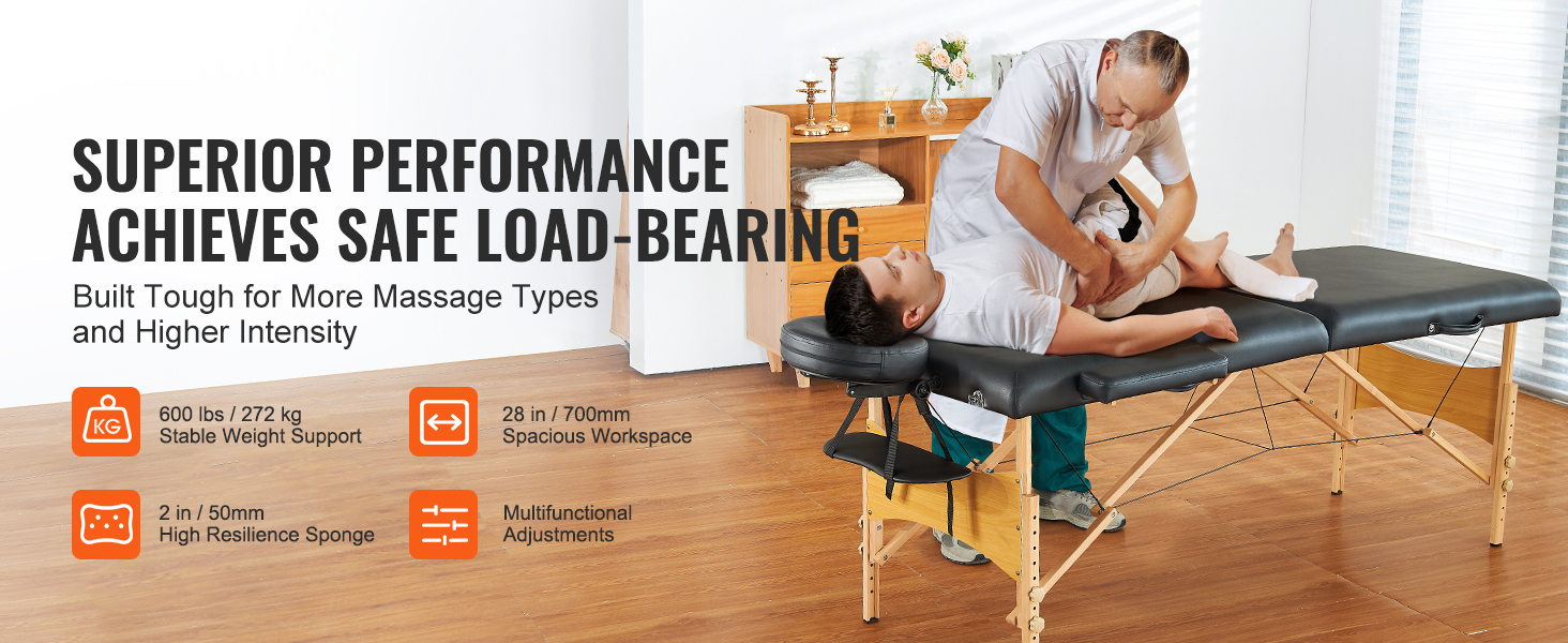Portable and the right size, 28-inch wide tabletop and widened side armrests provide ample space for your clients to fully relax. With the capacity to support the weight of two adults, our portable folding massage table is the ideal tool for massages, spinal treatments, and therapy sessions.