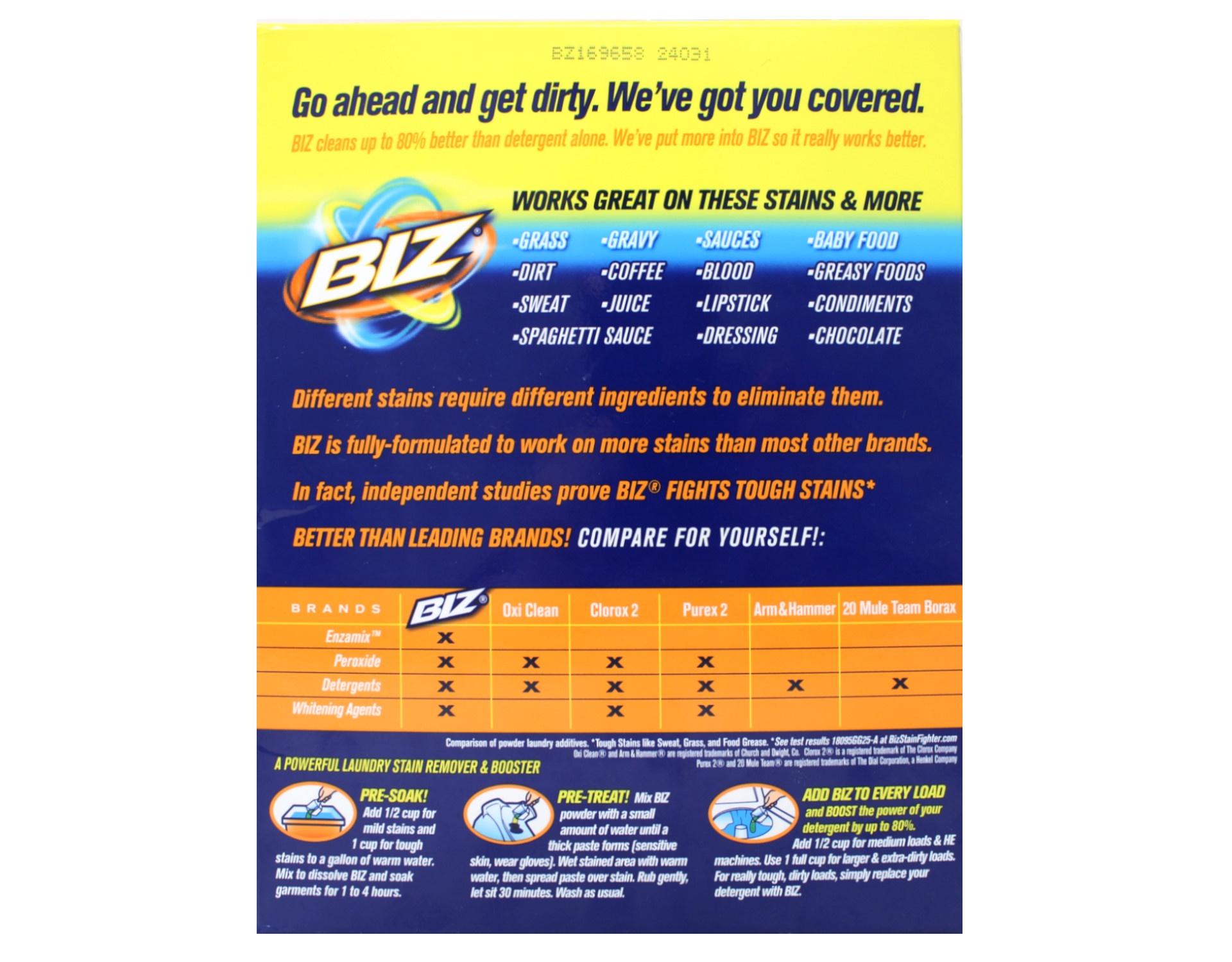 BIZ POWDER Cleans up to 80% BETTER than detergent alone MORE STAIN FIGHTERS than other brands Fights tough stains BETTER THAN LEADING BRANDS guaranteed! Contains a UNIQUE blend of enzymes which quickly dissolves stains and odors Made with BIODEGRADABLE surfactants The original form of BIZ®! Add Biz Powder to every load to boost the cleaning power of your detergent and eliminate tough stains. Pre-Soak: Dissolve 1/2 cup Biz in a gallon of warm water and soak garments 1-4 hours. Pre-Treat: Wet the stained area, make a paste with Biz Powder and warm water. Spread paste over the stain, let sit up to 30 minutes, then wash as usual.
