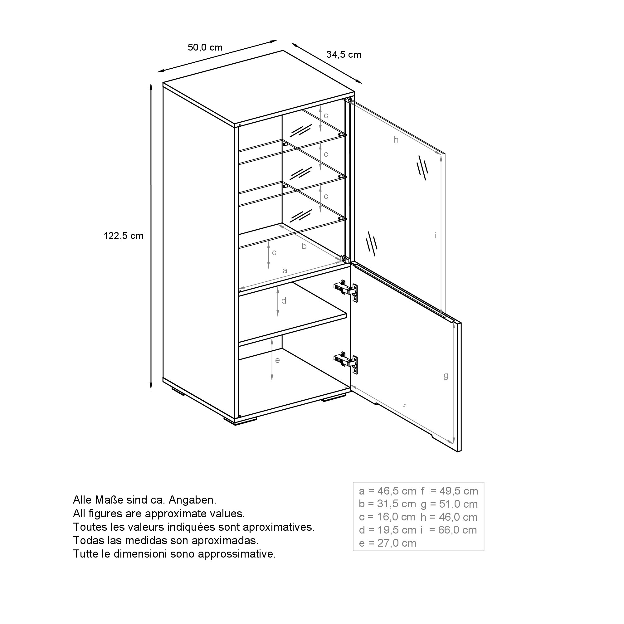 Hinter der Glastür finden Ihre Schätze in vier geräumigen Fächern und auf drei Glaseinlegeböden den perfekten Platz. Und hinter der unteren Tür stehen zwei zusätzliche Fächer für persönliche Gegenstände zur Verfügung.