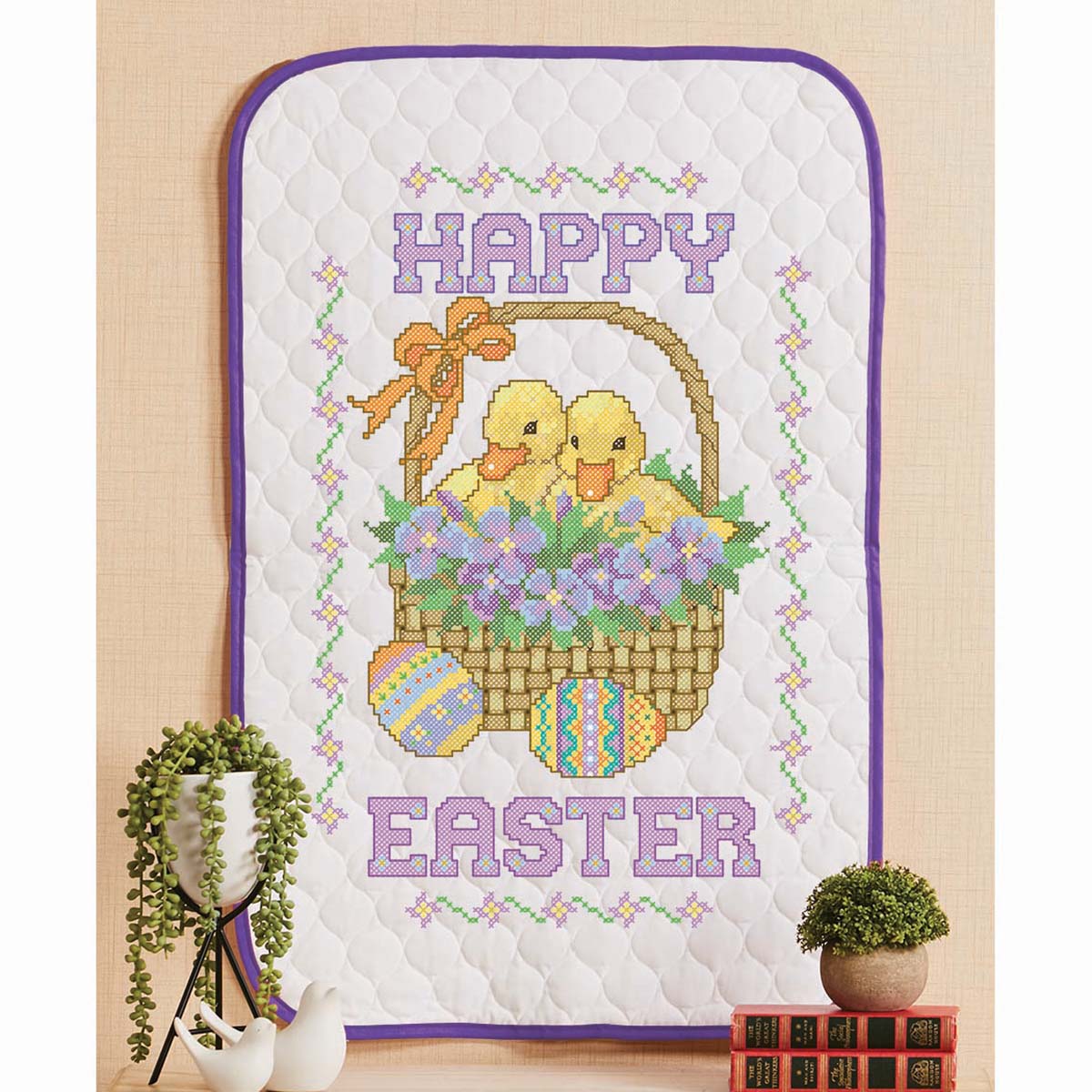 Darling ducks deliver a joyful seasonal message on this pre-quilted wall hanging! This spring wall hanging design features two yellow ducks in a basket of purple flowers with decorated Easter eggs and a greeting of Happy Easter. This pretty design is stamped for stitching on pre-quilted white fabric with a purple binding. As it is pre-quilted and pre-finished, there are no extra sewing or quilting skills needed. The kit includes everything you need to complete the project: the stamped wall hanging, cotton floss, floss organizer, needle, and stitching instructions. Simply follow the easy-to-read chart and instructions to cross-stitch stamped design on the wall hanging, and it is ready to display! The finished wall hanging measures 22 x 34" (58 x 86cm). Made in U.S.A. and imported. • This cross-stitch wall hanging is ready for stitching with two ducks in a basket of flowers next to a pair of decorated eggs and the words Happy Easter. • The pre-finished wall hanging is stamped for cross-stitch on pre-quilted white fabric with a purple binding. • Kit includes stamped wall hanging, cotton floss, floss organizer, needle, and instructions. • Wall hanging measures 22 x 34" (58 x 86cm).