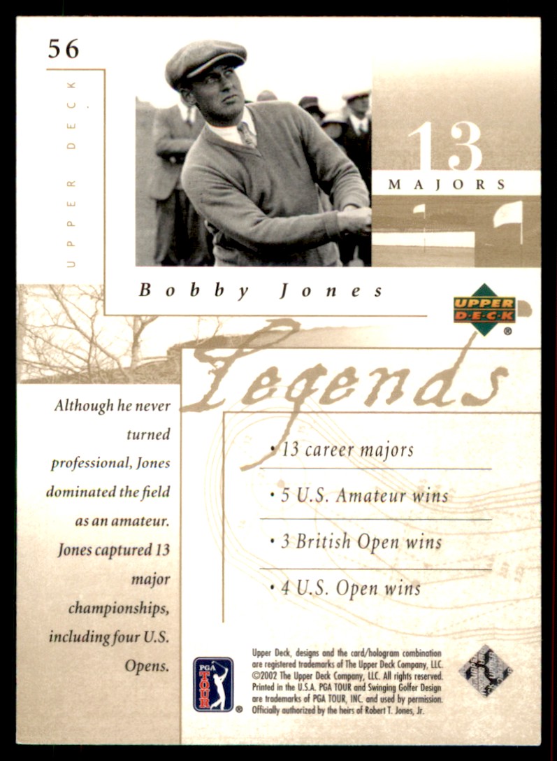 | Description: | Bobby Jones | | Category: | Golf | | Year: | 2001 | | Product: | Upper Deck | | Card Number: | 56 | | Dimensions: | 3½" x 2½" |