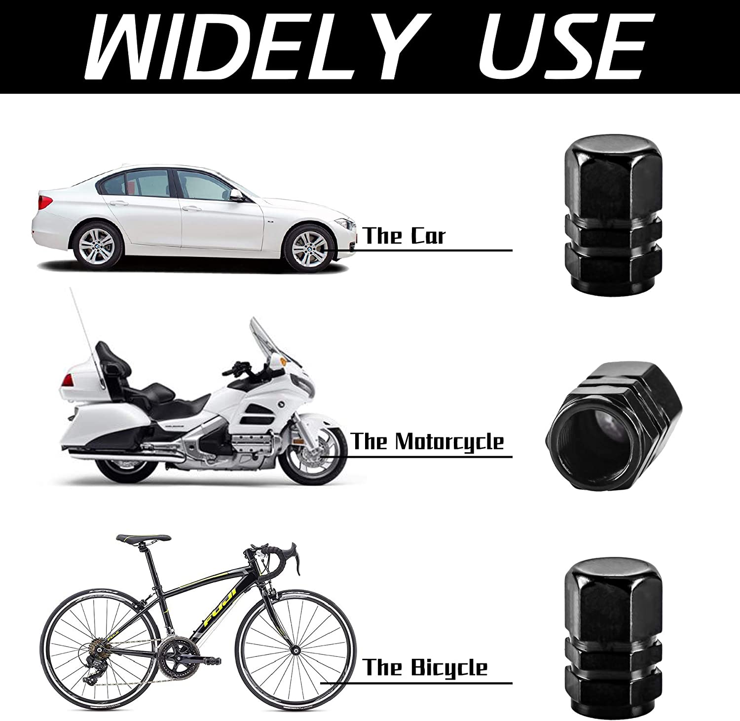 Universal: Fits cars, trucks, bikes with a standard valve stem