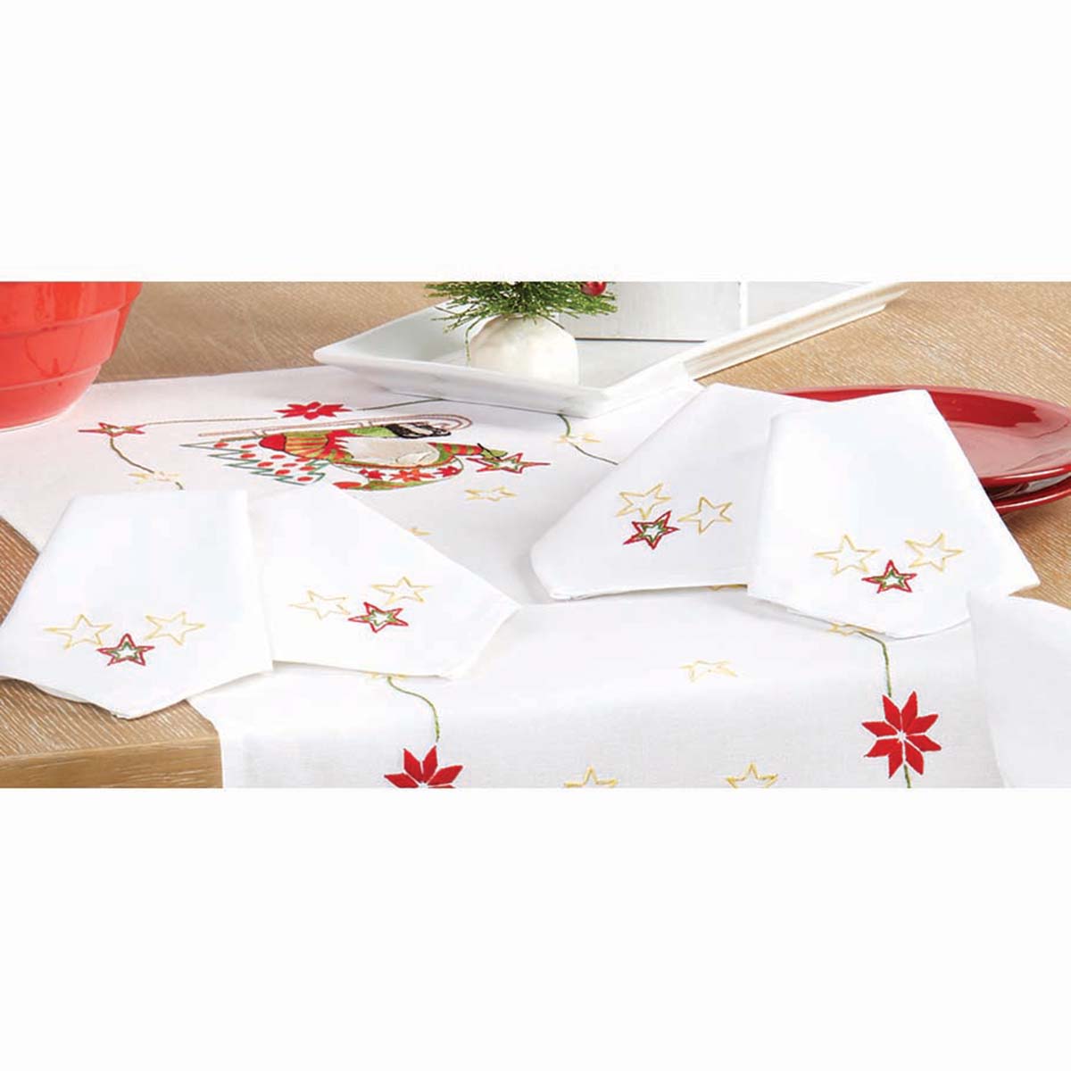 These Christmas napkin designs feature a merry red poinsettia bloom with two gold stars as a simple yet festive addition to your holiday table. These embroidery designs are stamped for stitching on white 100% cotton fabric with a hemmed edge. The kit includes cotton floss, needle, and instructions. This set includes four 15 x 15" (38 x 38cm) napkins. The napkins are pre-finished and ready for stitching. Simply follow the easy-to-read chart and instructions to stitch the designs. Imported from Austria. • These napkins are ready for stitching with red poinsettias and gold stars. • The napkins are stamped for embroidery on white 100 % cotton fabric with a hemmed edge. • Kit includes napkins, cotton floss, needle, and instructions. • Set contains four napkins. • Napkins measure 15 x 15" (38 x 38cm) each.