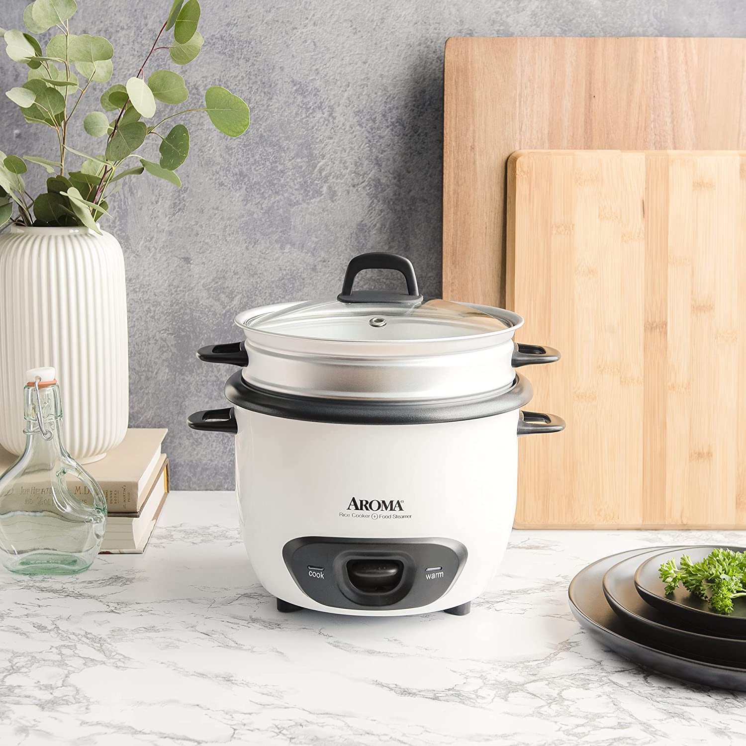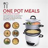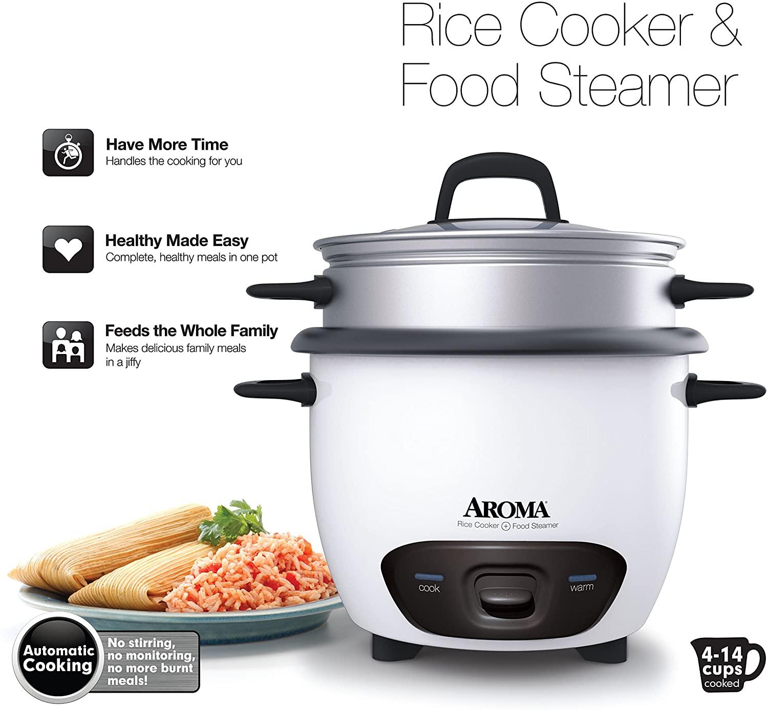 Enjoy easy home cooking with the Aroma 14-Cup (Cooked) Pot Style Rice Cooker and Food Steamer. Prepare 4 to 14 cups of restaurant-quality rice at the press of a switch. Once the rice has cooked to perfection, the rice cooker automatically switches over to its Keep-Warm setting. So you don't have to spend time worrying about stirring or monitoring the rice as it cooks. The included steam tray also steams meats and vegetables while rice simultaneously cooks below for an endless supply of meals that are as tasty as they are easy. This versatile appliance is also great for jambalaya, oatmeal, soup, stew, chili and much more! Once the cooking is done, the nonstick inner cooking pot and all accessories are dishwasher-safe for quick and easy cleaning.