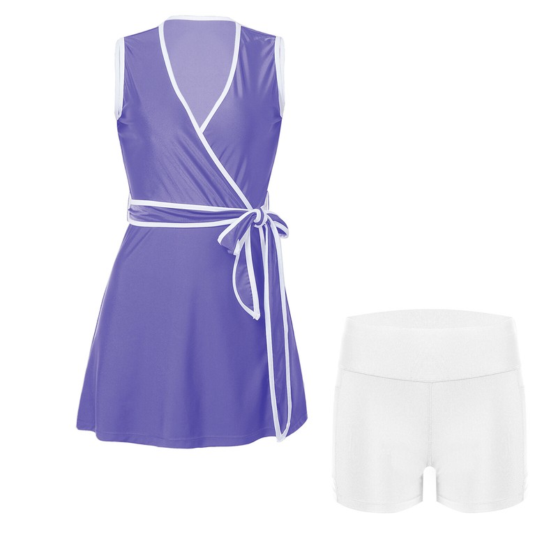 Women’s v neck sleeveless tennis dress with wrap front and contrast color trim to create a modern sporty look.