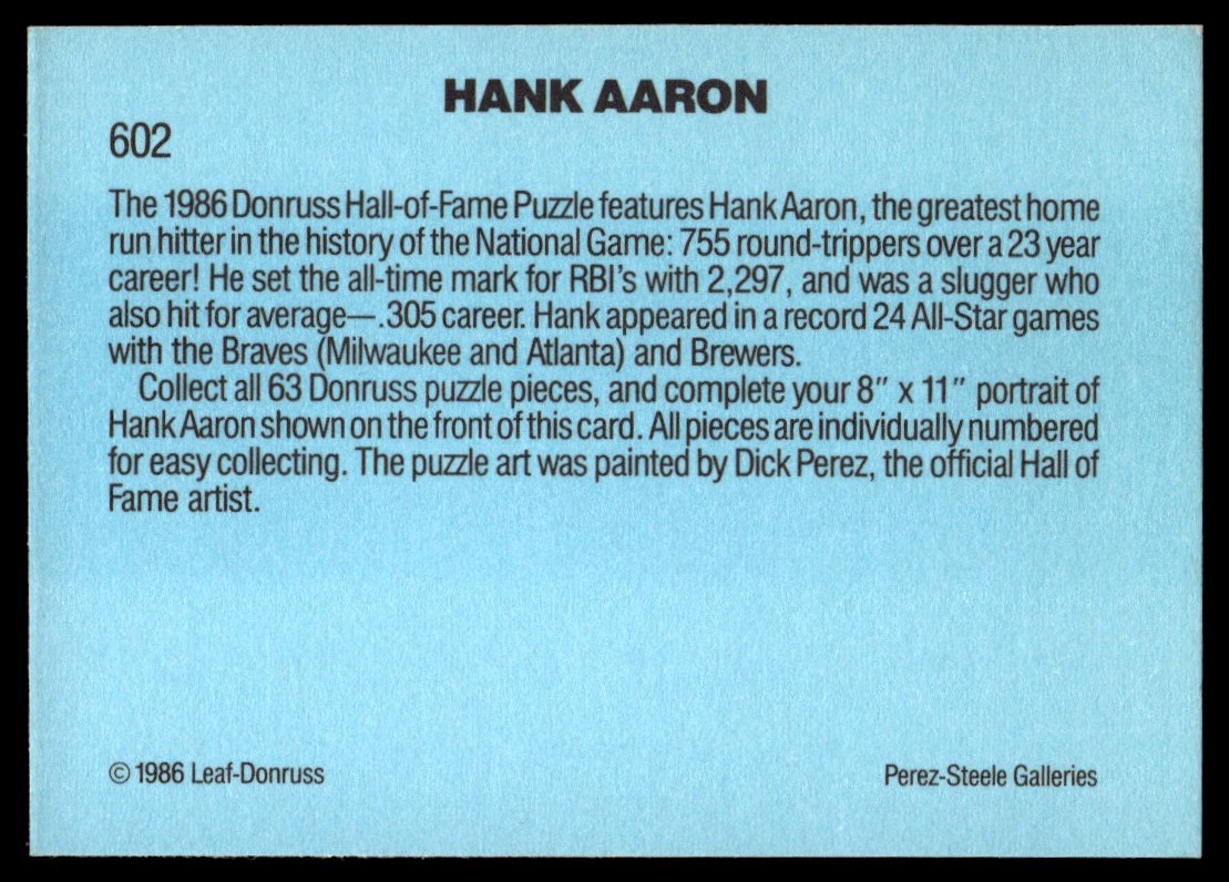 | 1986 Donruss Baseball Card Hank Aaron Atlanta Braves #602 |