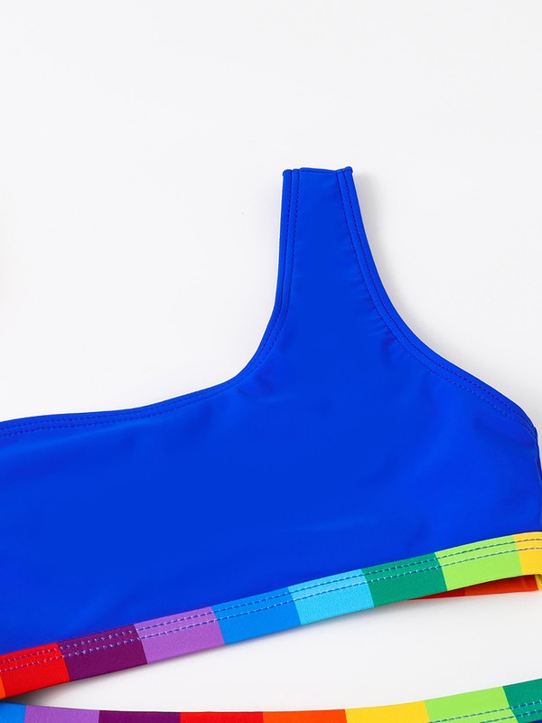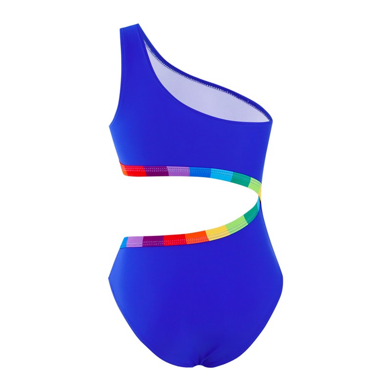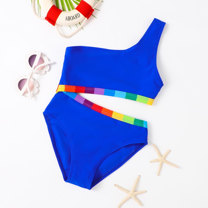 Bright blue color with rainbow color block at waist make girl active and beautiful. Provides UPF 50+ rating sun protection.