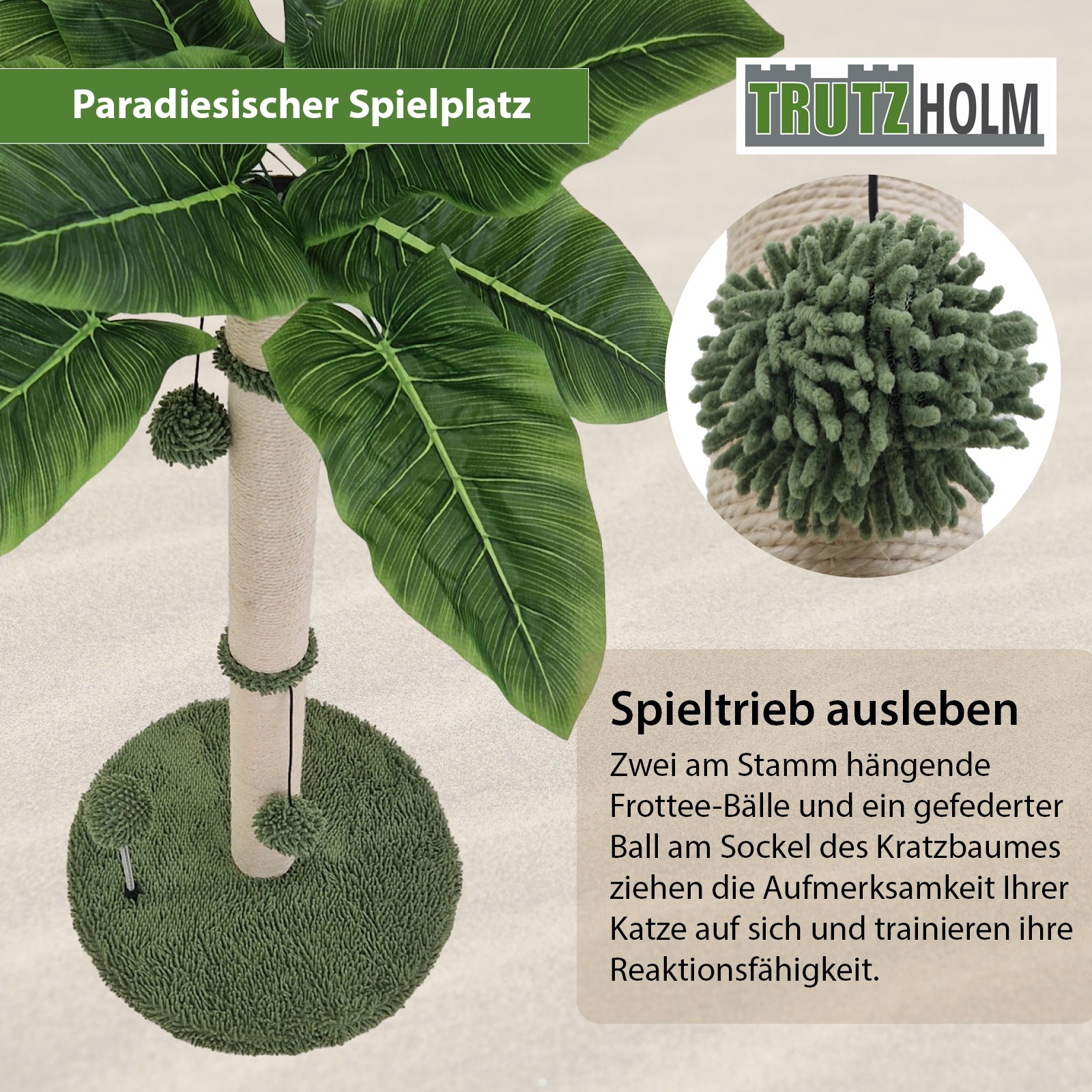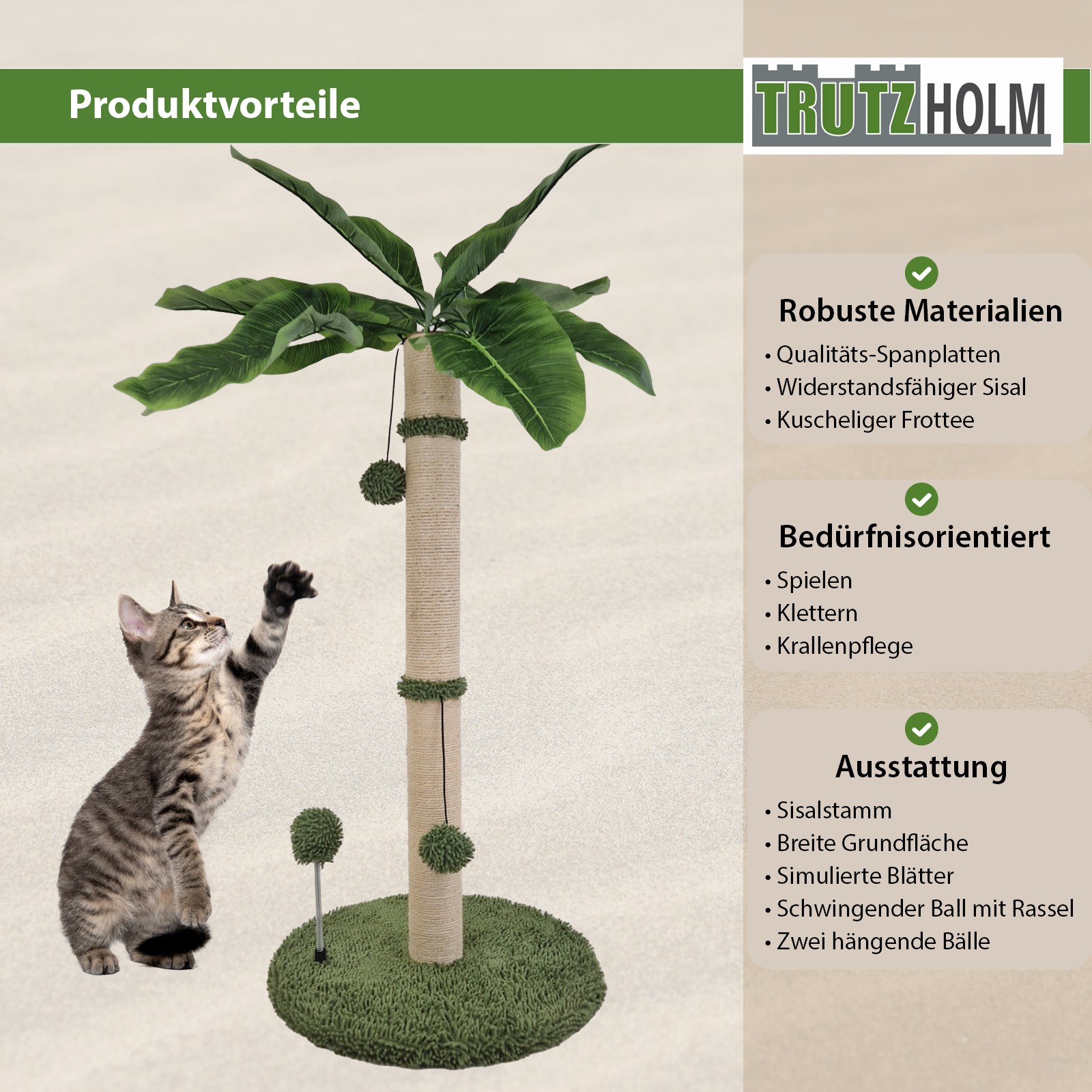 - B LIEBEVOLLES DESIGN: Die Kletterpalme von TRUTZHOLM im zeitlosen Design fügt sich durch die natürlichen Farben perfekt in jede Umgebung ein und wird sofort die Aufmerksamkeit Ihrer Kätzchen, ob groß oder klein, gewinnen. Der Stamm lädt zum Klettern ein, während 3 Bälle zum Spielen animieren.