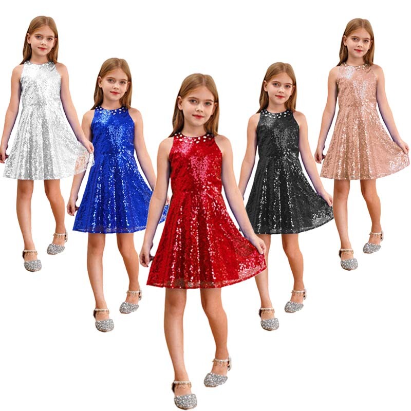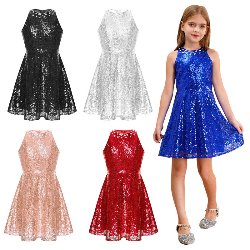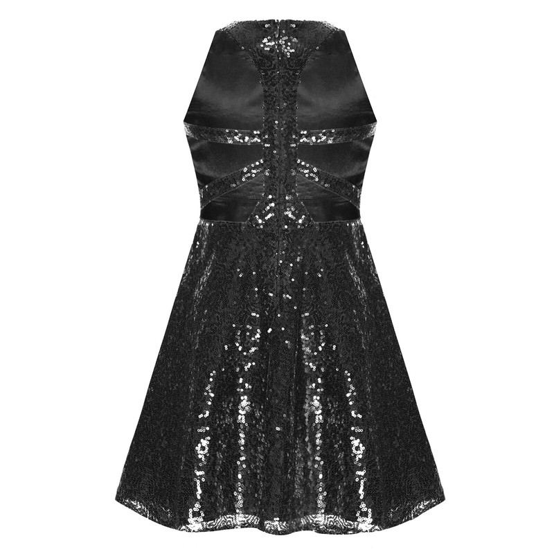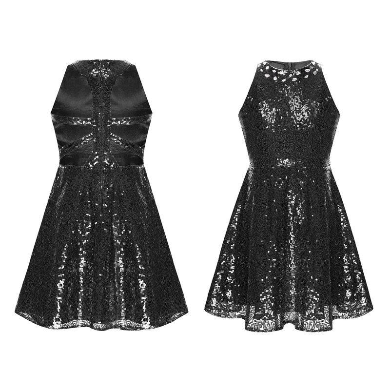 Kids Girls Sleeveless Oblique Shoulder Sequins Floral Decorated Dance Dress.