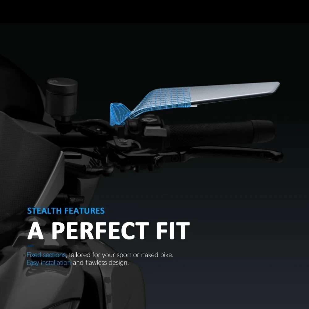 --Out of the interface between racing experience and aeronautical inspiration comes a new mirror: an accessory specifically designed for supersport bikes. It consists of a fixed part, which allows the fitting directly to the fairing, and a movable part, which acts as a mirror glass holder. --Thanks to a rotating system, by a simple movement, the two parts get alligned: in closed position the mirror becomes an aerodynamic foil.