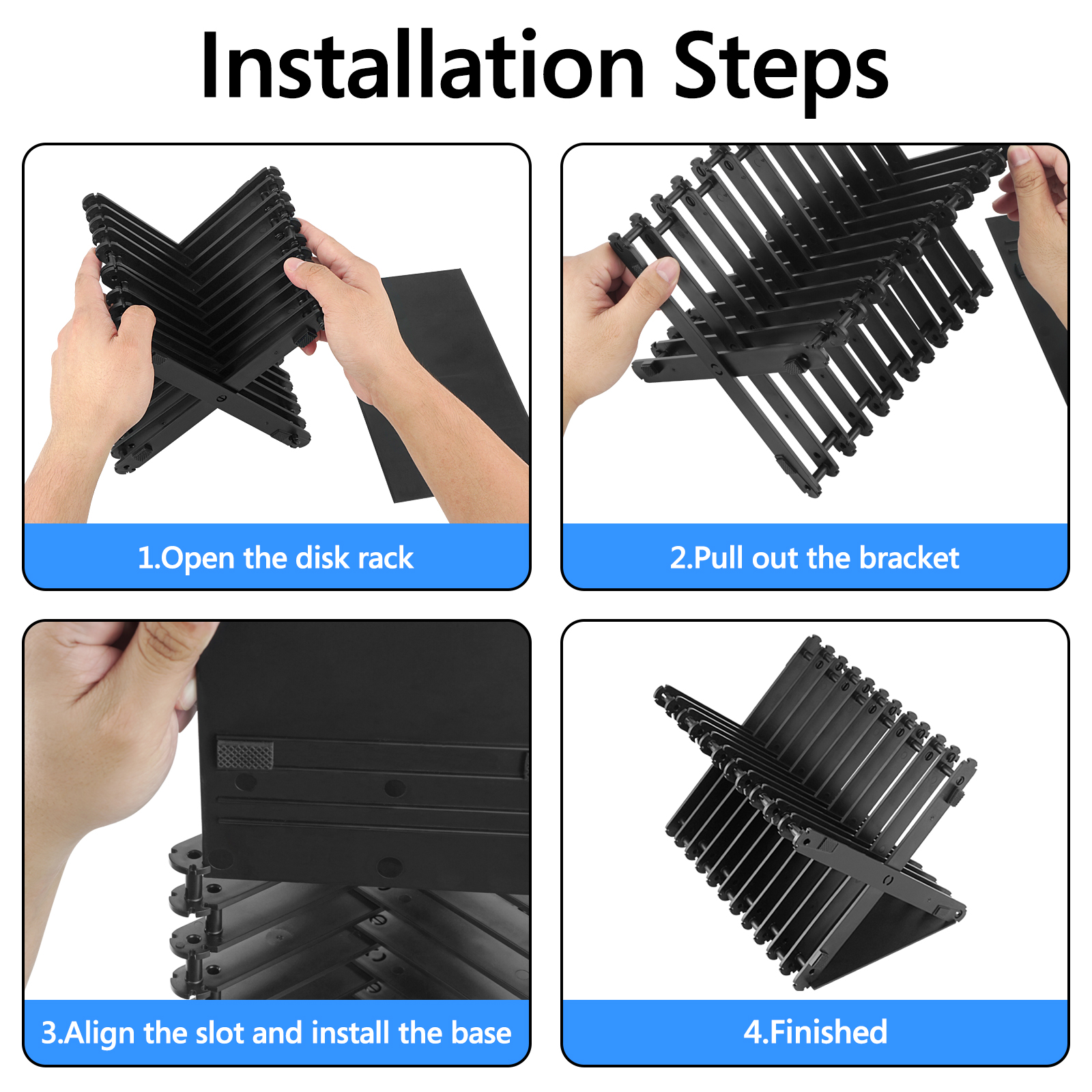 - Game disc storage rack strong, light, durable, stable, simple portable, easily stored, and save space can be used upright, flat to used, or stuck on the backing to adjust the different angles.