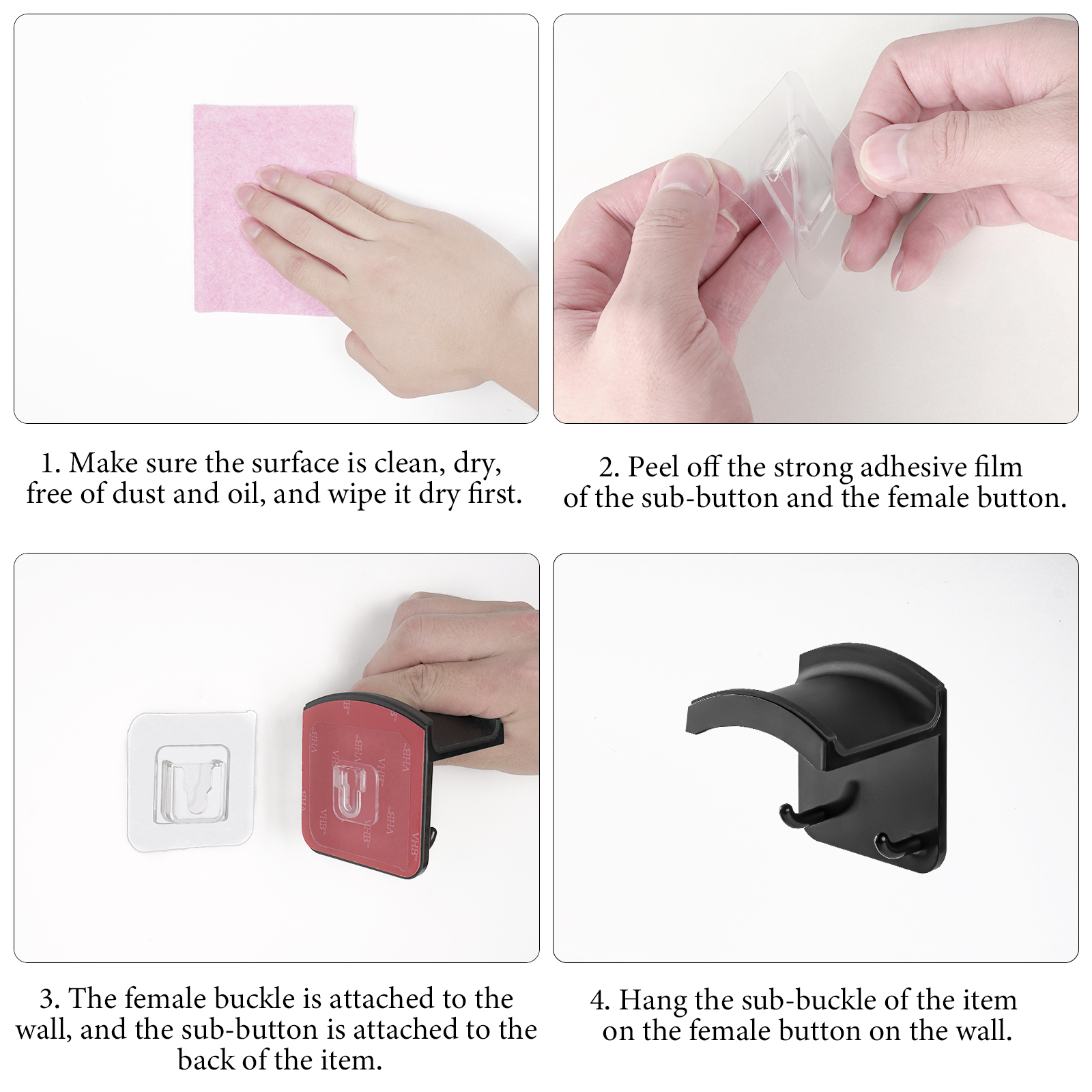 - Installation steps: Make sure the surface is clean, dry, free of dust and oil, and wipe it dry first. Peel off the strong adhesive film of the sub-button and the female button. The female buckle is attached to the wall, and the sub-button is attached to the back of the item. Hang the sub-buckle of the item on the female button on the wall.