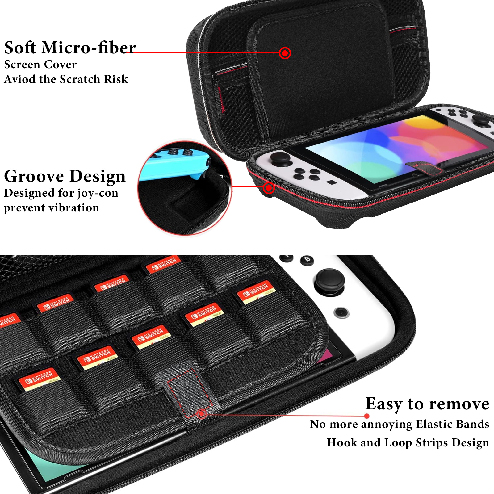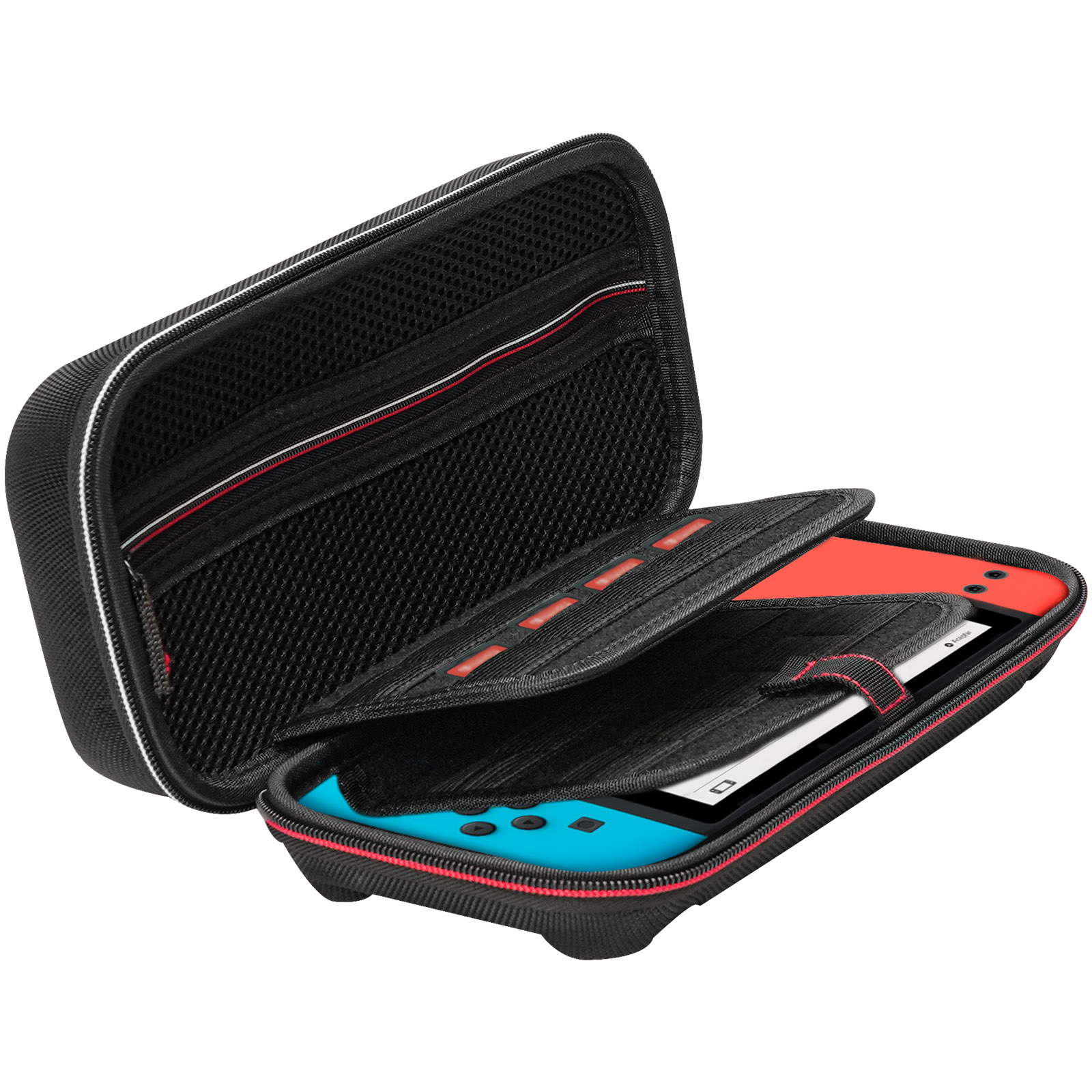 - High Capacity: The hard shell protective case protects the Switch's screen from scratches and has extra space to hold 20 game cards and micro SD cards. Small mesh compartments inside hold extra JoyCons, cables, games, and other smaller but essential accessories.