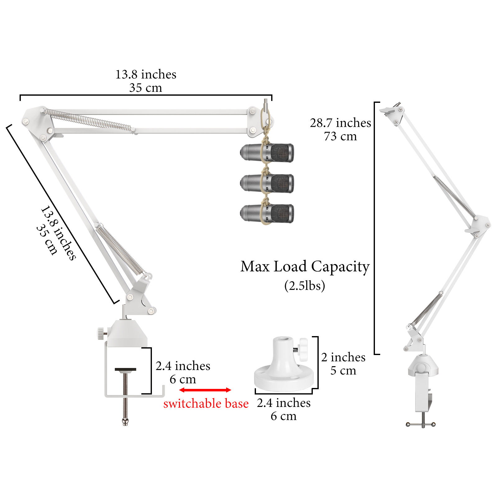 - The durable construction and articulating design provides a total arm reach of 28.7 inch / 73 cm while accommodating mic weighing up to 2.5 lb / 1.13 kg.