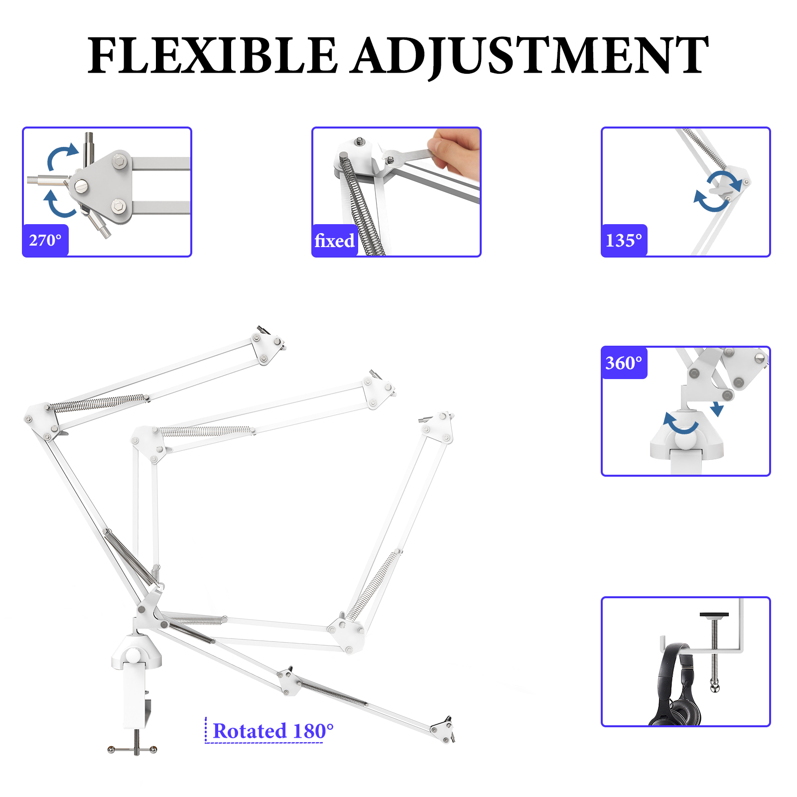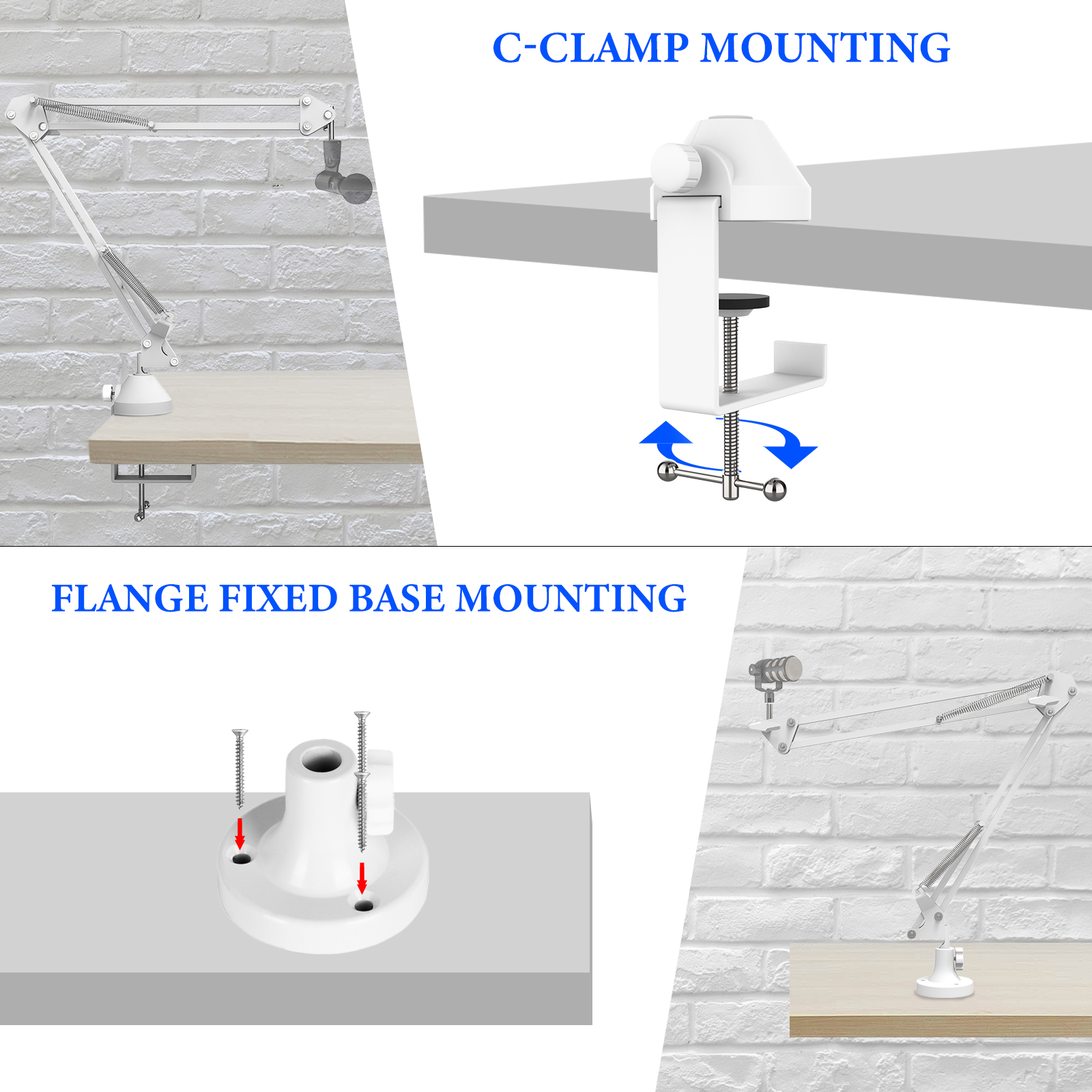 - The desktop mic extension arm can be attached to a table or desk up to 2.4 inch / 6 cm thick with the included C-clamp mount, which can swivel 360.