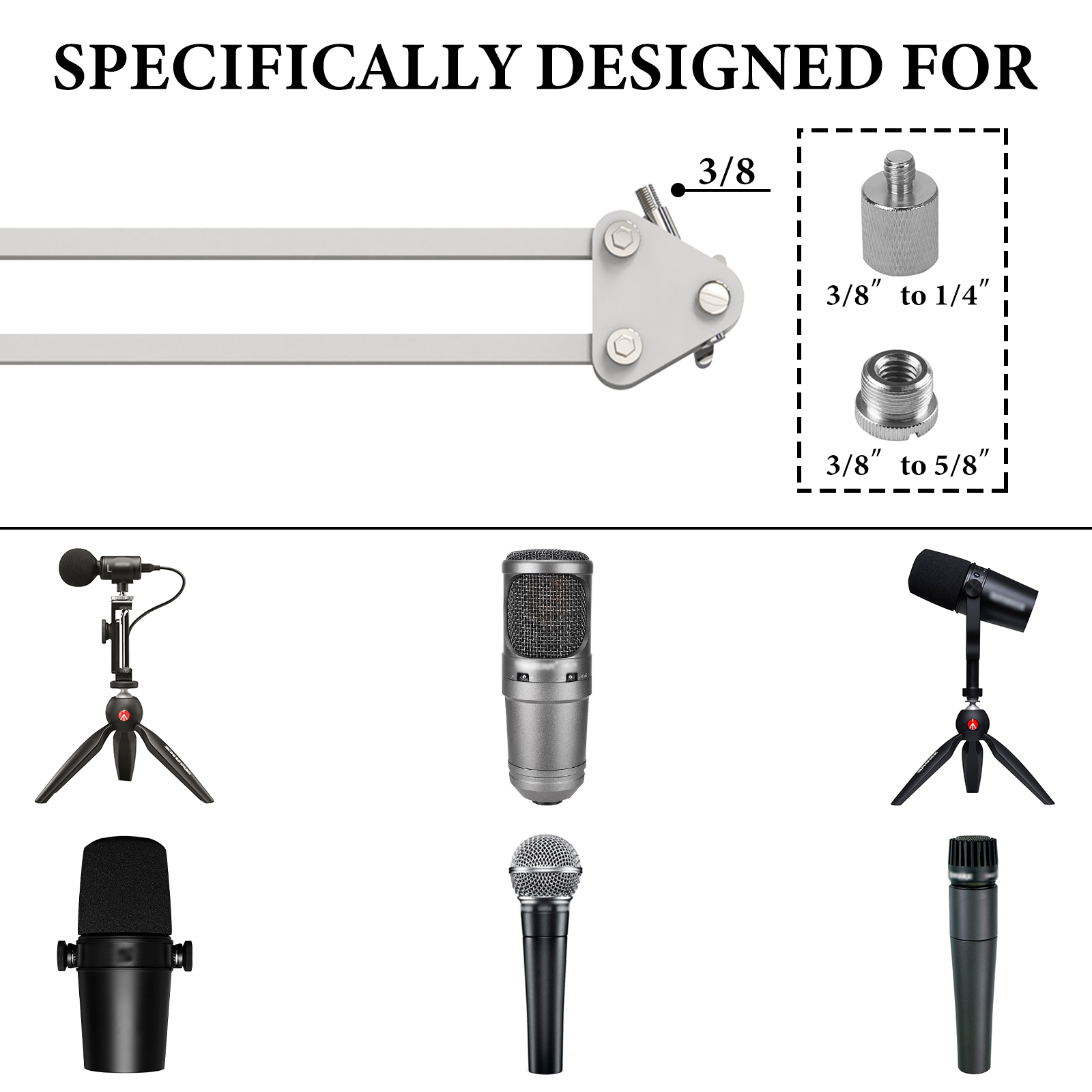 - Include 3/8" to 5/8" screw adapter compatible with Shure MV7+, MV88+, SM7B, MV7, MV7X, SM57 mic boom arm.