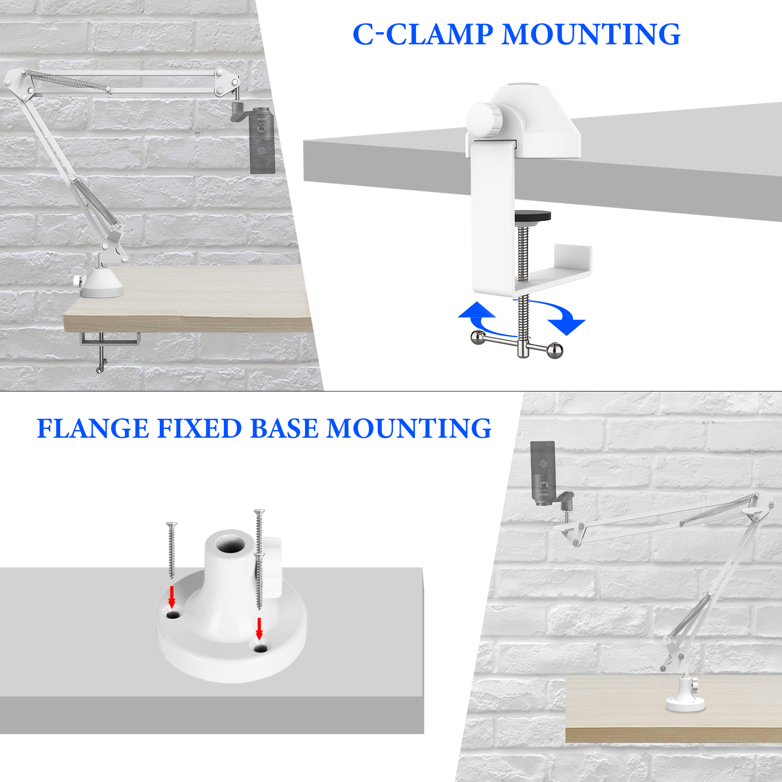 - The desktop mic extension arm can be attached to a table or desk up to 2.4 inch / 6 cm thick with the included C-clamp mount, which can swivel 360.