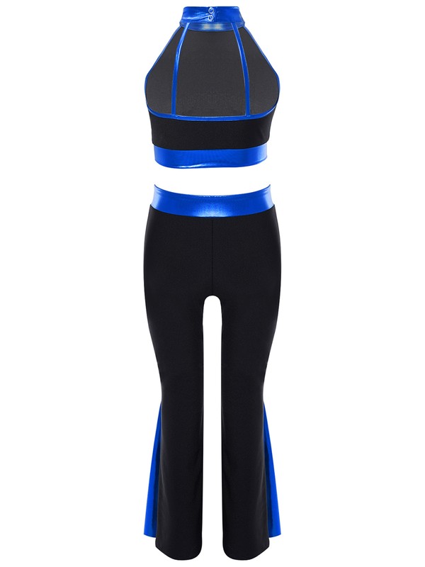 Set include halter sleeveless backless crop top and high waist elastic waistband patchwork flared pants.