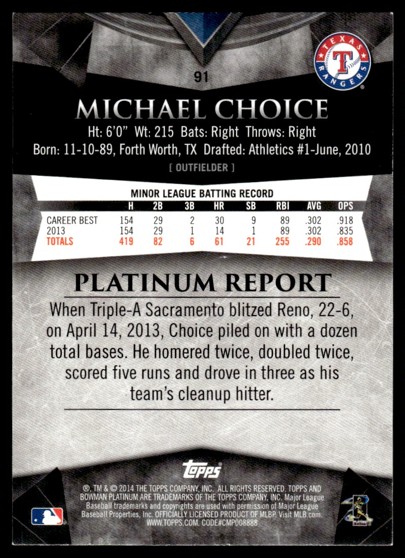 | 2014 Bowman Platinum Michael Choice RC Texas Rangers #91 Signed |