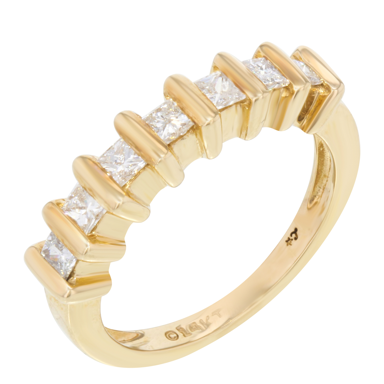 This beautifully crafted yellow gold princess-cut diamond wedding band is breathtaking. There are 7 princess-cut diamonds in bar setting of G-H color, SI1-SI2 clarity, weighing 0.45 carats. Express your unending love for one another with this diamond princess cut wedding band. The ring width is 3 mm. Ring size 7. Total weight: 4.4 gms. Comes with a presentable gift box.