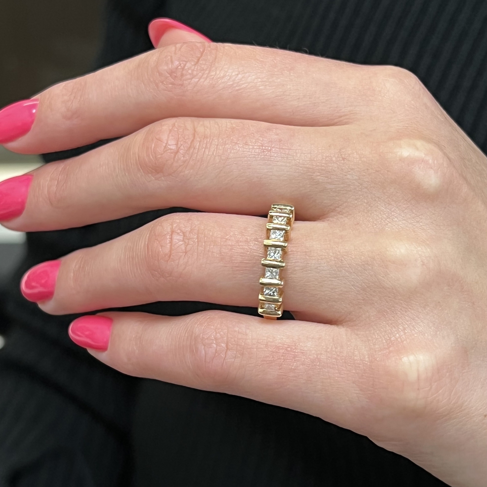 An image of a Rachel Koen women's wedding band ring with diamonds, showcased in a frontal view against a white background. The ring is designed with a series of alternating vertical gold bars and princess-cut diamonds around the band, creating a pattern. The band is made of polished yellow gold, and the diamonds are mounted in a bar setting. The image is taken from a close and direct angle, focusing on the top half of the ring to provide a clear view of the diamond arrangement and the intricate details of the gold band. 2nd image of Rachel Koen 014816 Ring with Diamonds, New condition 3rd image of Rachel Koen 014816 Ring with Diamonds, New condition Model Wearing Ring