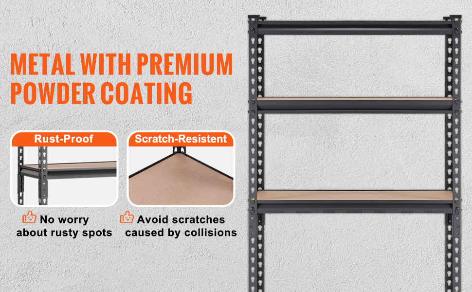 Our heavy duty storage shelf comes dressed in a stylish powder coating that doesn't just look good but fights off water and scratches. It promises to stay sleek and new, refusing to peel or oxidize, even after a long haul.