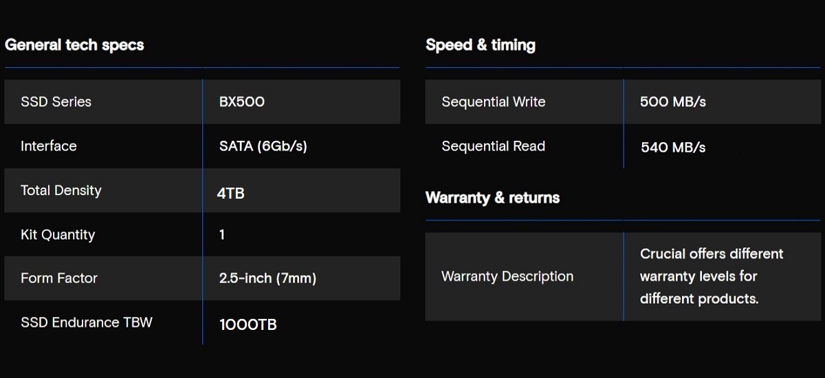 Crucial BX500 4TB SSD 540MB/s SATA III 2.5" Internal Solid State Drive CT4000BX500SSD1