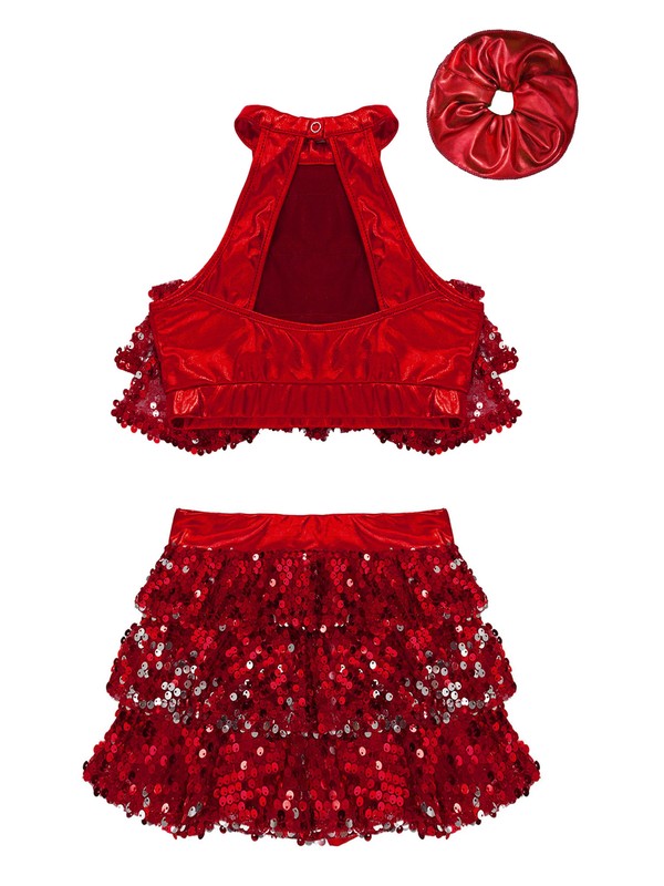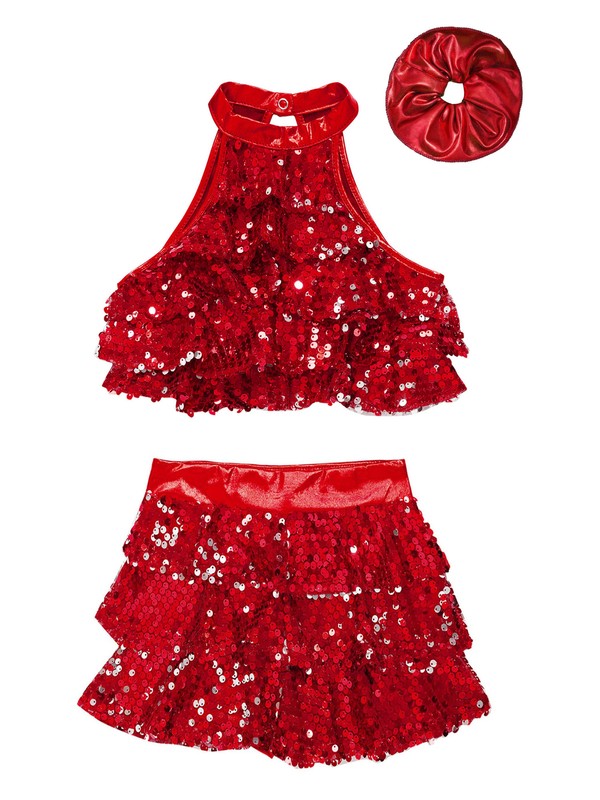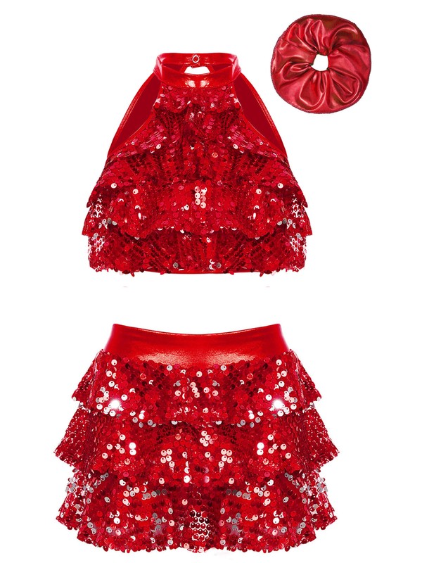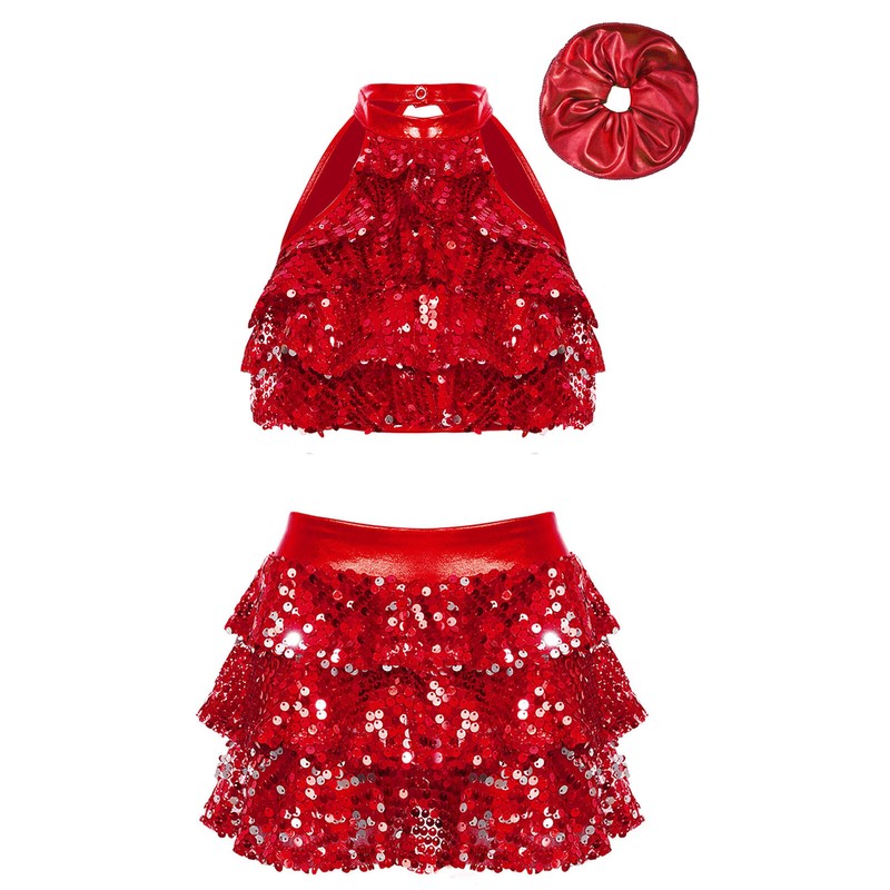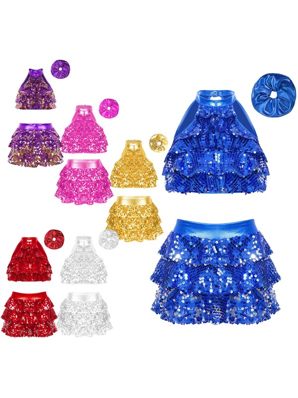 Matching with a hair band and culottes, tiered design ruffles with sequins, sparkle under the light to brighten up any performance.