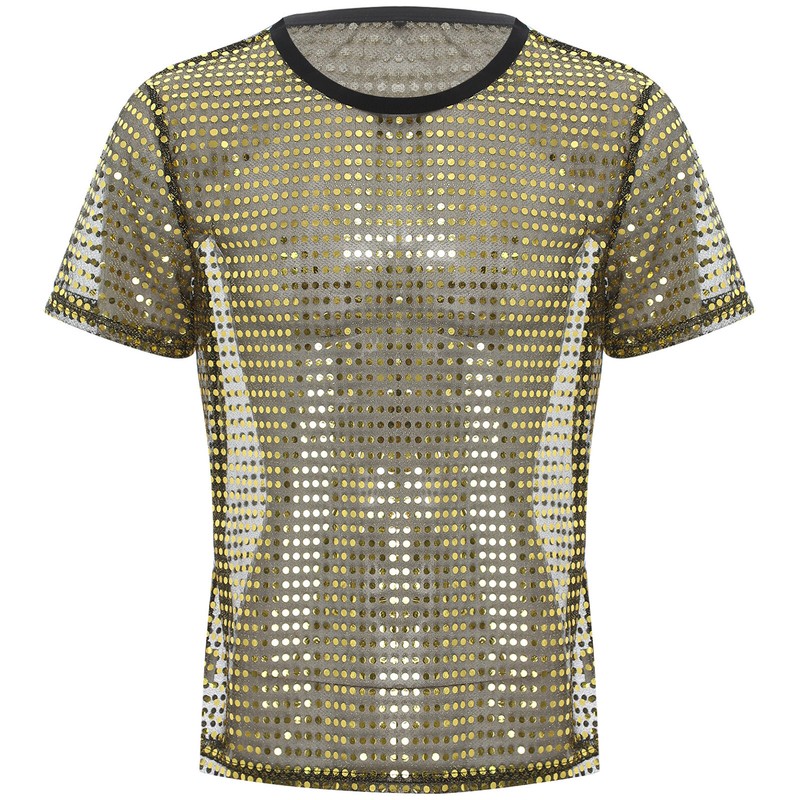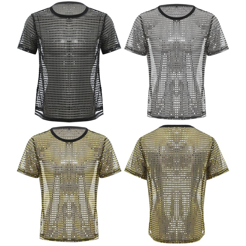 Shirt for men designs with round neck, short sleeve, shiny sequins and sheer mesh, pullover T-shirt makes you dazzling and attractive.
