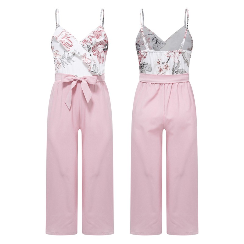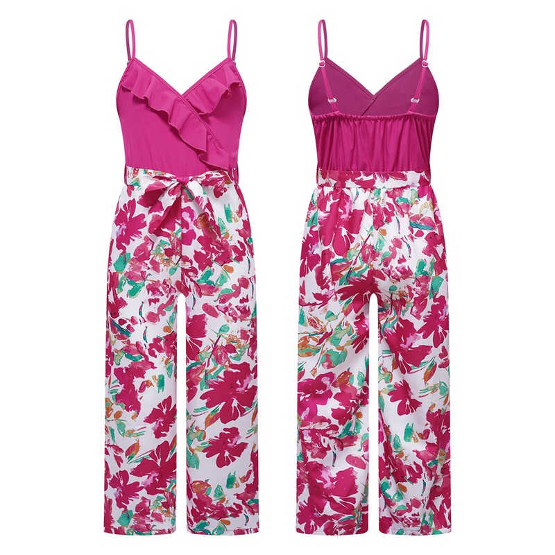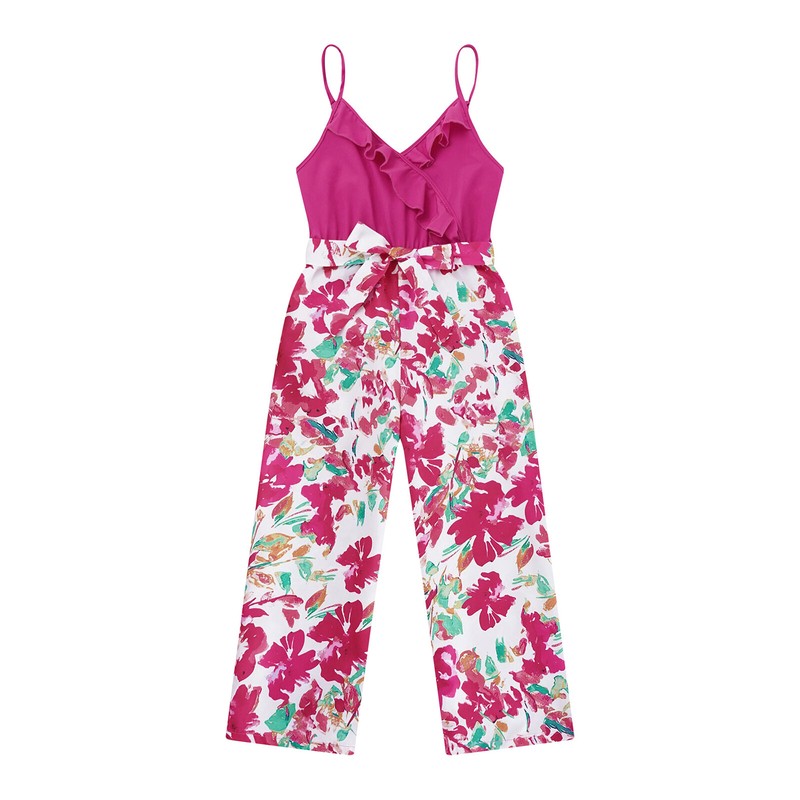 Jumpsuit with floral print and ruffle details make your girl look cute and elegant. Adjustable spaghetti straps and elastic waist for a better fit.