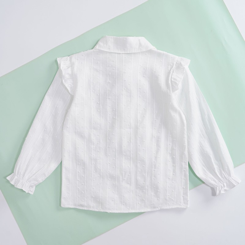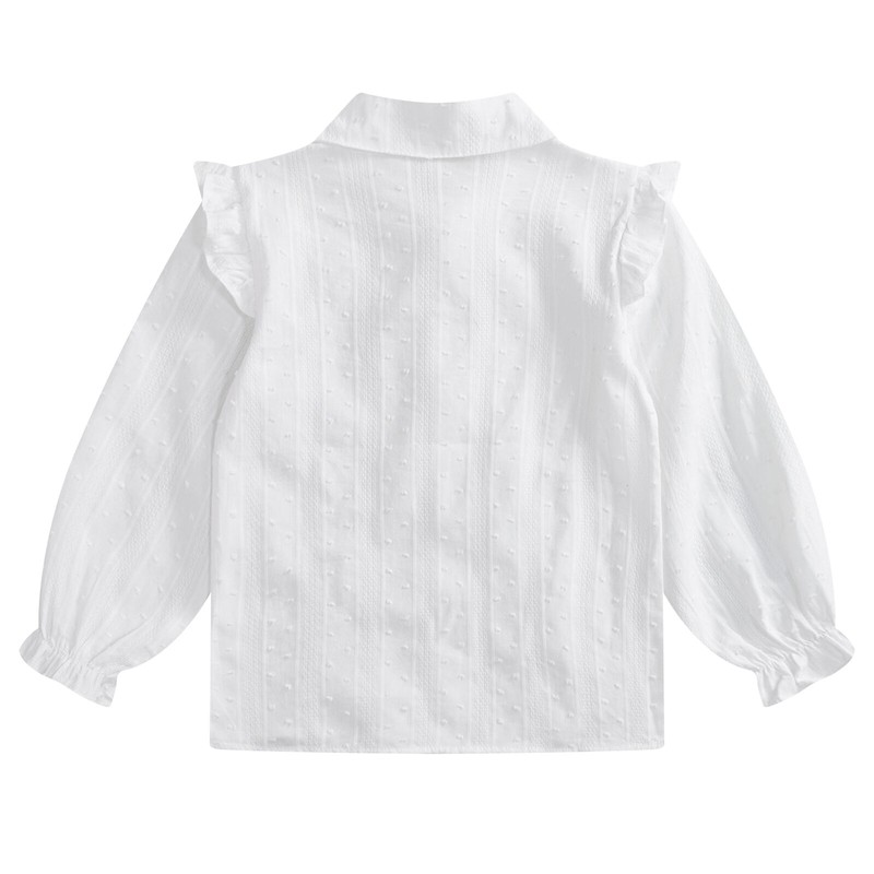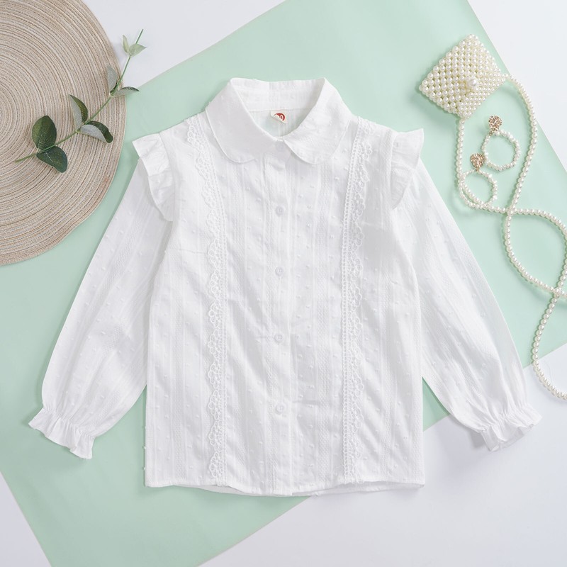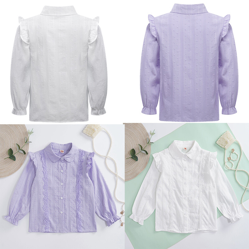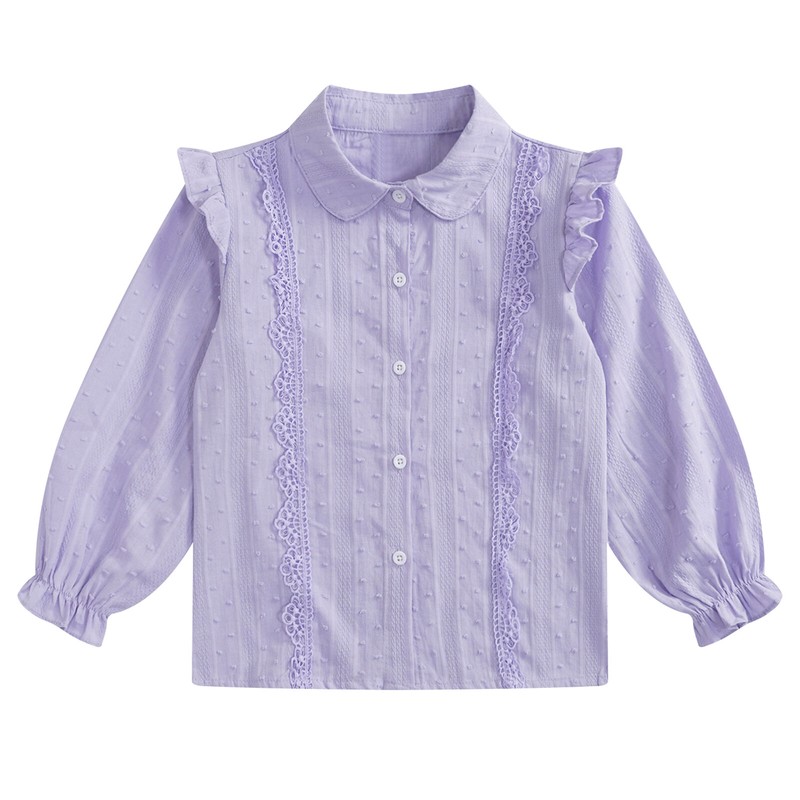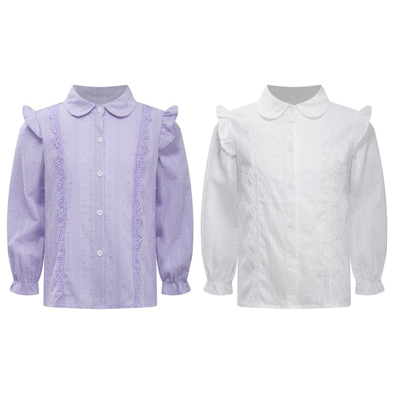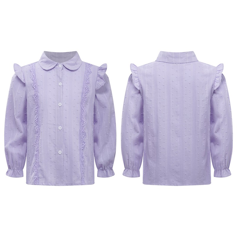 Turn-down collar shirt for girls, long sleeves with elastic cuffs, buttons closure allows for easy wearing.