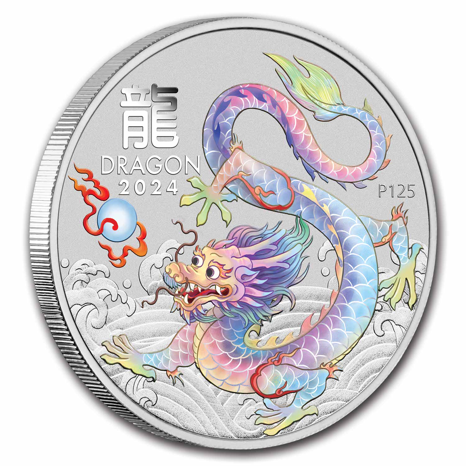 - Reverse: Portrays a lively white colorized Chinese dragon with a flaming pearl. The flaming pearl is a symbol of wisdom in Chinese culture. Included in the design is the Chinese character for dragon, the inscription DRAGON 2024, and a P125 mint mark signifying The Perth Mint's 125th anniversary.