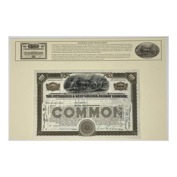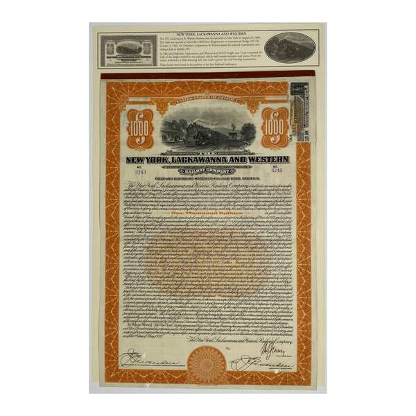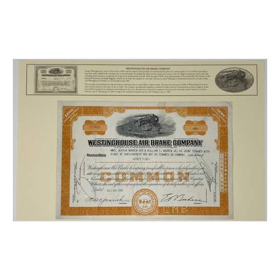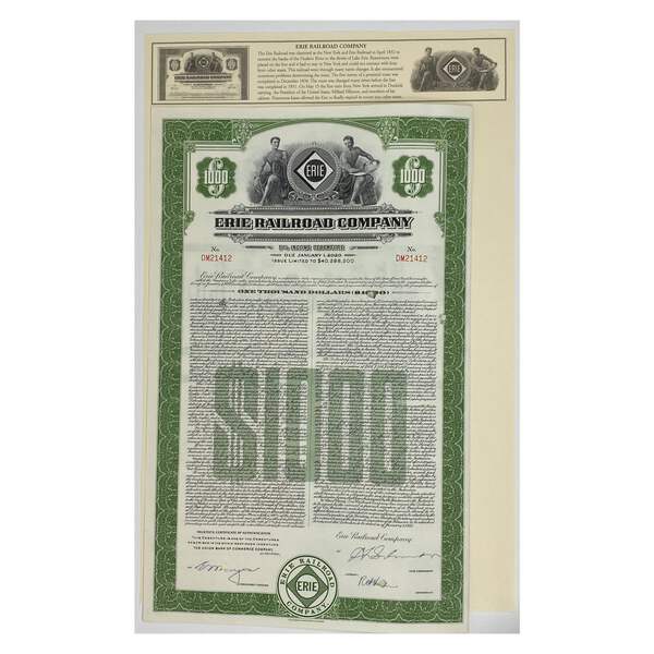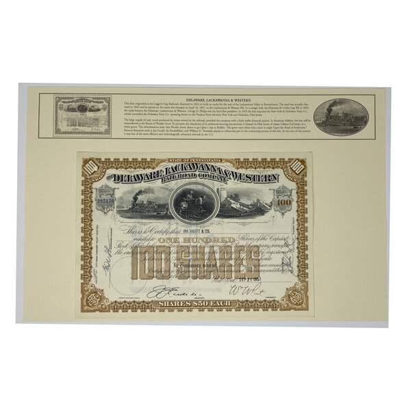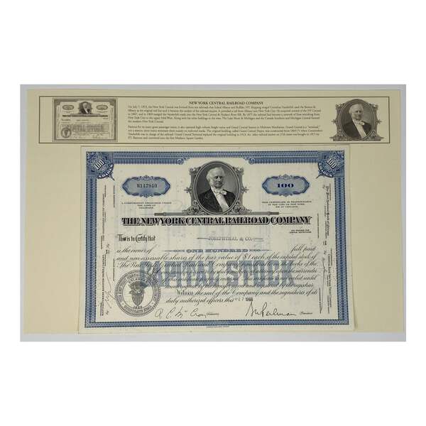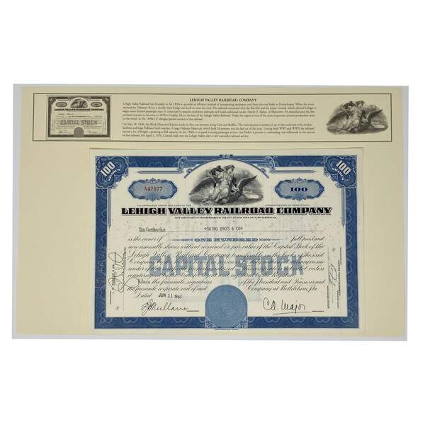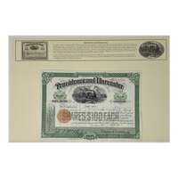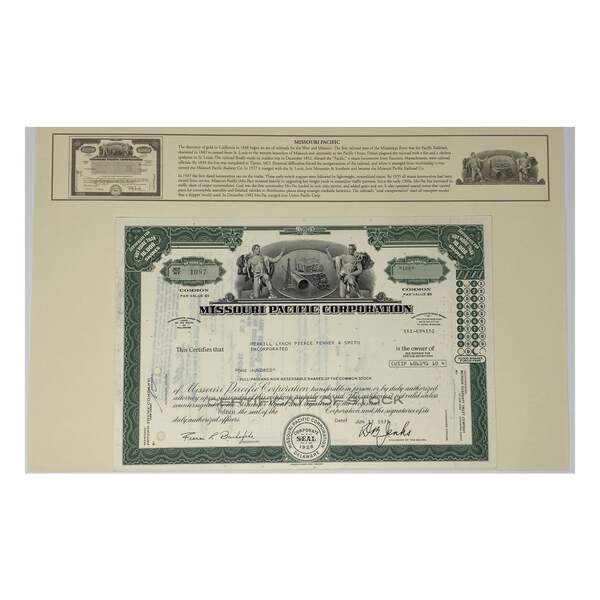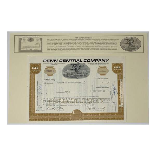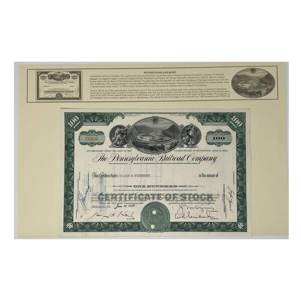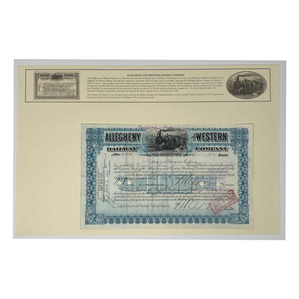 Product Description: This is an exceptional collection of 25 stock and bond certificates from great American railroads houséd in a professional quality display album, complete with printed information about each historic company. This deluxe presentation set makes for a great coffee table piece and conversation starter while also protecting your collection. All certificates date from the 1920’s to the 1970’s, with most from the 1950’s to 1970’s. Consider pairing with the presentation set of 25 Great American Corporations. Railroad companies included: Allegheny & Western, Baltimore & Ohio, Boston & Albany, Boston & Maine, Boston & Providence, Cleveland & Toledo, Delaware, Lackawanna & Western, Erie Railroad, Erie-Lackawanna, Lehigh Valley, Michigan Southern & Northern Indiana, Missouri Pacific, New York Central, New York, Lackawanna & Western, New York Elimination of Rail Road Grade Crossings, Old Colony, Penn Central, Pennsylvania Railroad, Pittsburgh & West Virginia, Providence & Worcester, Reading, Seatrain Lines, Union Pacific, West Shore Railroad, and Westinghouse Air Brake. Stock and Bond Certificates Explained A stock certificate is a physical piece of paper representing ownership in a company. Stock certificates include information such as the shareholder name, number of shares owned, date issued, an identification number, and usually a corporate seal and signatures. Unlike a stock, a bond is a fixed income instrument that represents a loan made by an investor to a borrower, typically a government or corporation, to finance projects and operations. A bond certificate includes the loan terms, bond holder, principal due date, schedule of interest payments, and usually a corporate seal and signatures. Many vintage bond certificates also include attached interest payment coupons, which needed to be physically cut off the bond and redeemed for each interest payment. Certificates are Historic Works of Art Throughout history, companies competed to produce the most impressive stock and bond certificates, with brilliant colors, intricate designs, and beautiful vignettes. However, with the rise of the internet and online brokerage firms in the 1990s, the need for physical certificates disappeared. One by one, companies quietly discontinued issuance of their paper stocks and bonds. A newsworthy example was Walt Disney's decision in 2013 to phase out their colorful stock certificates featuring renditions of their beloved animated characters. The eventual demise of the stock certificate ends a tradition that extends back at least 400 years, when the Dutch East Indies Company became the first company to issue certificates. Today, the beautiful stock and bond certificates that remain are enduring relics from a bygone era in American financial history. Quality and Authenticity is Guaranteed The expert staff of Olevian Numismatic Rarities unconditionally guarantees the authenticity of every historic document we sell, and all signatures contained therein. A certificate of authenticity will be included with each item. Your purchase will match the quality of the product shown but may vary slightly due to the original nature of historical documents.