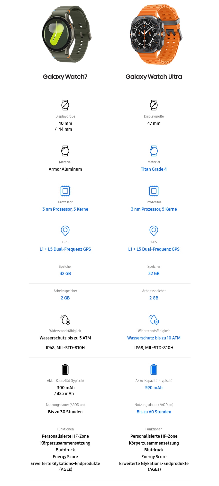* Die vordere und hintere Abdeckung des Metallrahmens (nicht das Display und die physischen Tasten) ist teilweise aus Titan Grad 4 gefertigt. Die übrigen Teile des Rahmens bestehen aus einer Titan Grad 2-Kunststoff-Mischung. ** IP68: Schutz bei dauerhaftem Untertauchen bei 1,5 m Wassertiefe für 30 Min. und ausschließlich klarem Wasser. Kein Schutz bei Salzwasser und anderen Flüssigkeiten, insbesondere Seifenlauge, Alkohol und/oder erhitzter Flüssigkeit. 10 ATM bietet Wasserschutz bis 10 ATM nach ISO-Standard 22810. Nicht geeignet für Aktivitäten wie Springen in das Becken, Sporttauchen, Wasserski oder ähnliche Wasseraktivitäten mit hoher Geschwindigkeit und/oder Aktivitäten in tiefem Wasser. Die Wasserdichtigkeit ist nicht von Dauer und kann mit der Zeit abnehmen. Weitere Informationen, einschließlich Pflege- und Gebrauchsanweisungen, findest du im Benutzerhandbuch. *** Akkulaufzeit bei internen Tests von Samsung erreicht. Die tatsächliche Akkulaufzeit kann je nach Netzwerkumgebung, Nutzerverhalten und anderen Faktoren variieren. **** Für eine größere Genauigkeit sollten Nutzer*innen ihr Gerät mindestens einmal im Monat kalibrieren. Die Funktion benötigt ein Samsung Galaxy Smartphone mit Android 10.0 oder aktueller. ***** Der Energy Score ist verfügbar auf Android Smartphones ab Android 10.0 und erfordert die aktuelle Version der Samsung Health-App sowie einen angemeldeten Samsung Account. Die Bestimmung des Energy Scores erfordert mind. die Aktivitäts- und Schlafdaten des Vortags, die Herzfrequenzdaten während des Schlafs sowie eine Galaxy Watch4 oder neuer oder den Galaxy Ring. Der Energy Score dient nur zu Fitness- und Wellnesszwecken. Nicht für die Verwendung zur Erkennung, Diagnose oder Behandlung medizinischer Zustände vorgesehen und lediglich zur persönlichen Information bestimmt. Für medizinische Beratung such bitte einen Arzt auf. ****** Endprodukte fortgeschrittener Glykierung erfordern die Anmeldung bei einem Samsung Konto und die Samsung Health-App Version 6.27 oder aktueller.