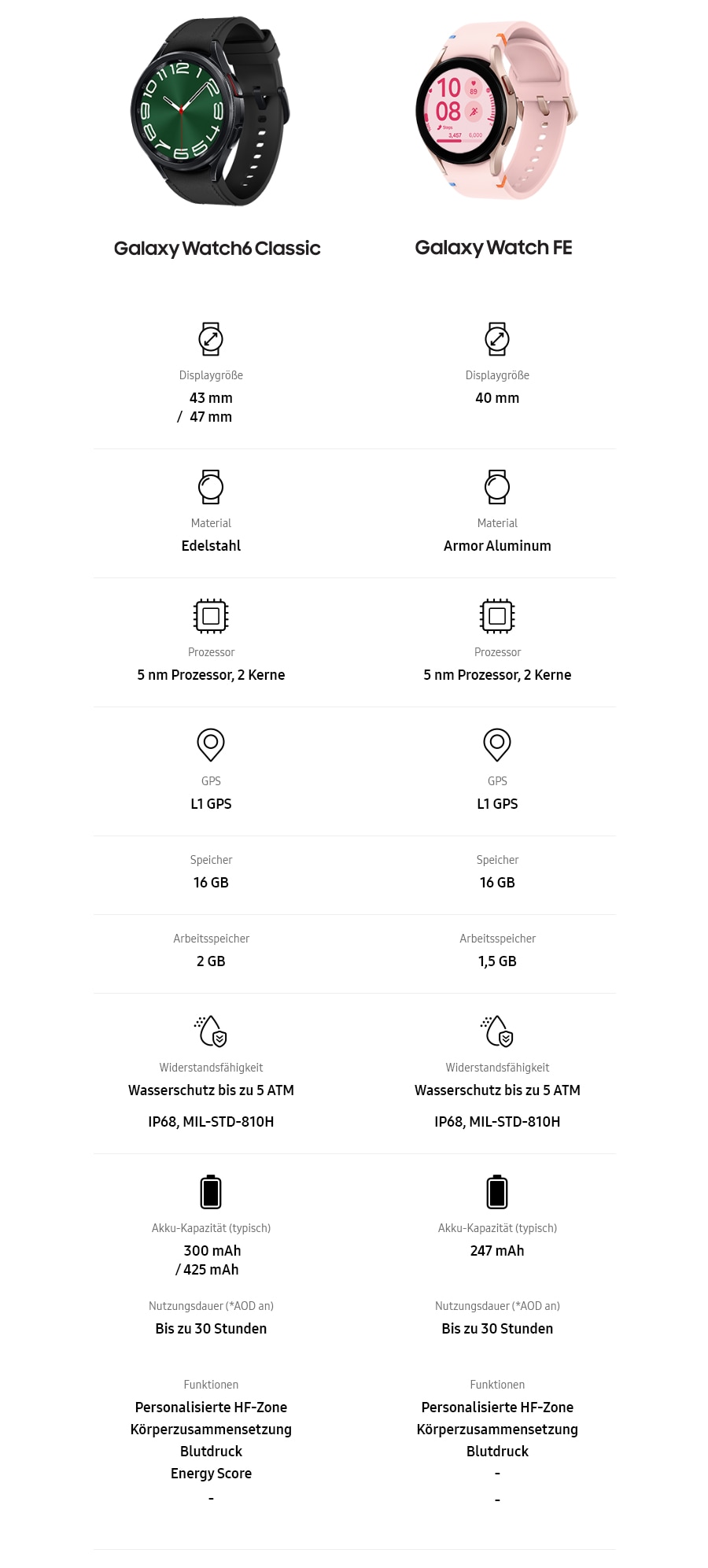 * Kompatible Smartphones und verfügbare Funktionen können je nach Land/Region, Anbieter oder Gerät variieren. ** Nur für allgemeine Wellness- und Fitnesszwecke. Die Ergebnisse dienen nicht zur Erkennung, Diagnose oder Behandlung von Krankheiten oder Beschwerden. *** Die Erfassung der Körperzusammensetzung wird nur von Modellen der Samsung Galaxy Watch4-Serie und neueren Samsung Galaxy Watch-Modellen unterstützt. Führe KEINE Körperzusammensetzungsanalyse durch, wenn du einen implantierten Herzschrittmacher oder andere implantierte medizinische Geräte hast oder schwanger bist. Alle gesundheitsbezogenen Informationen, auf die über das Gerät und die Anwendung zugegriffen wird, sind nicht als medizinischer Rat zu verstehen. Wenn du jünger als 20 Jahre alt bist, sind die Messergebnisse möglicherweise ungenau. Die Messungen sind nur für deinen persönlichen Gebrauch bestimmt. Bei Bedenken um die Gesundheit sollten Nutzer*innen unbedingt eine ärztliche Fachkraft aufsuchen.