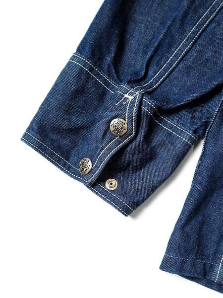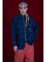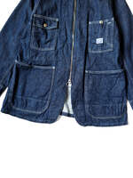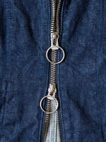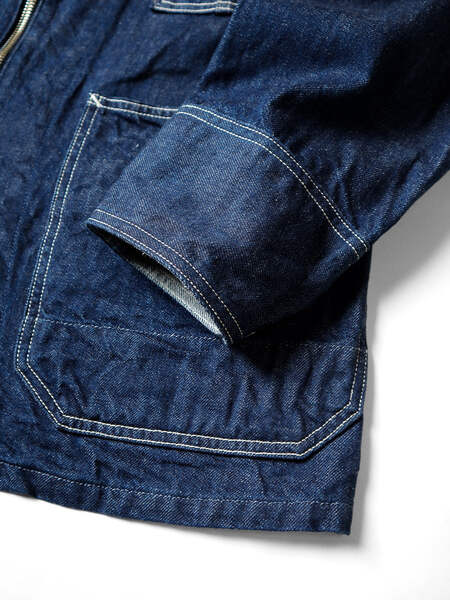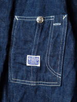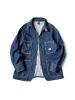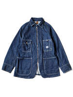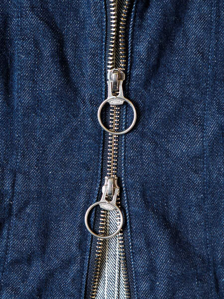 A coverall with a double zip front made of 11.5oz denim. It has a slightly slender silhouette and uses dot buttons for details.