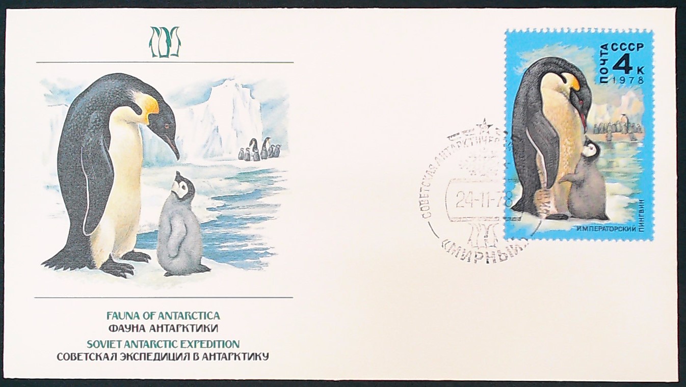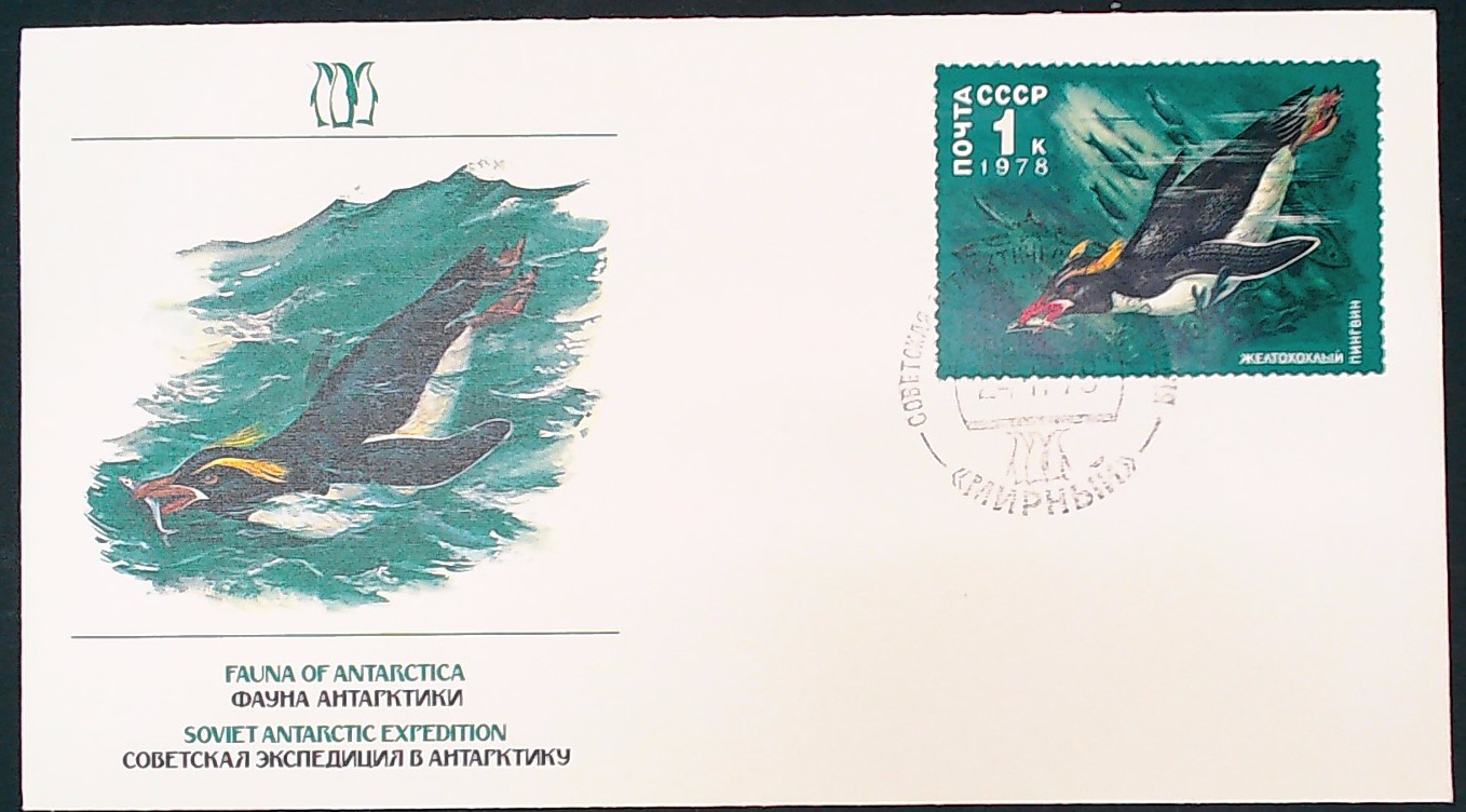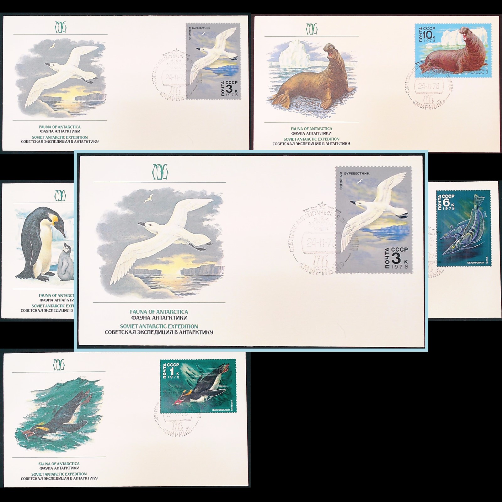 Explore the wonders of Antarctica with this complete set of 5 First Day Covers (FDCs) from the 1978 Soviet Antarctic Expedition series. Each cover features stunning artwork and stamps depicting the diverse fauna of Antarctica: