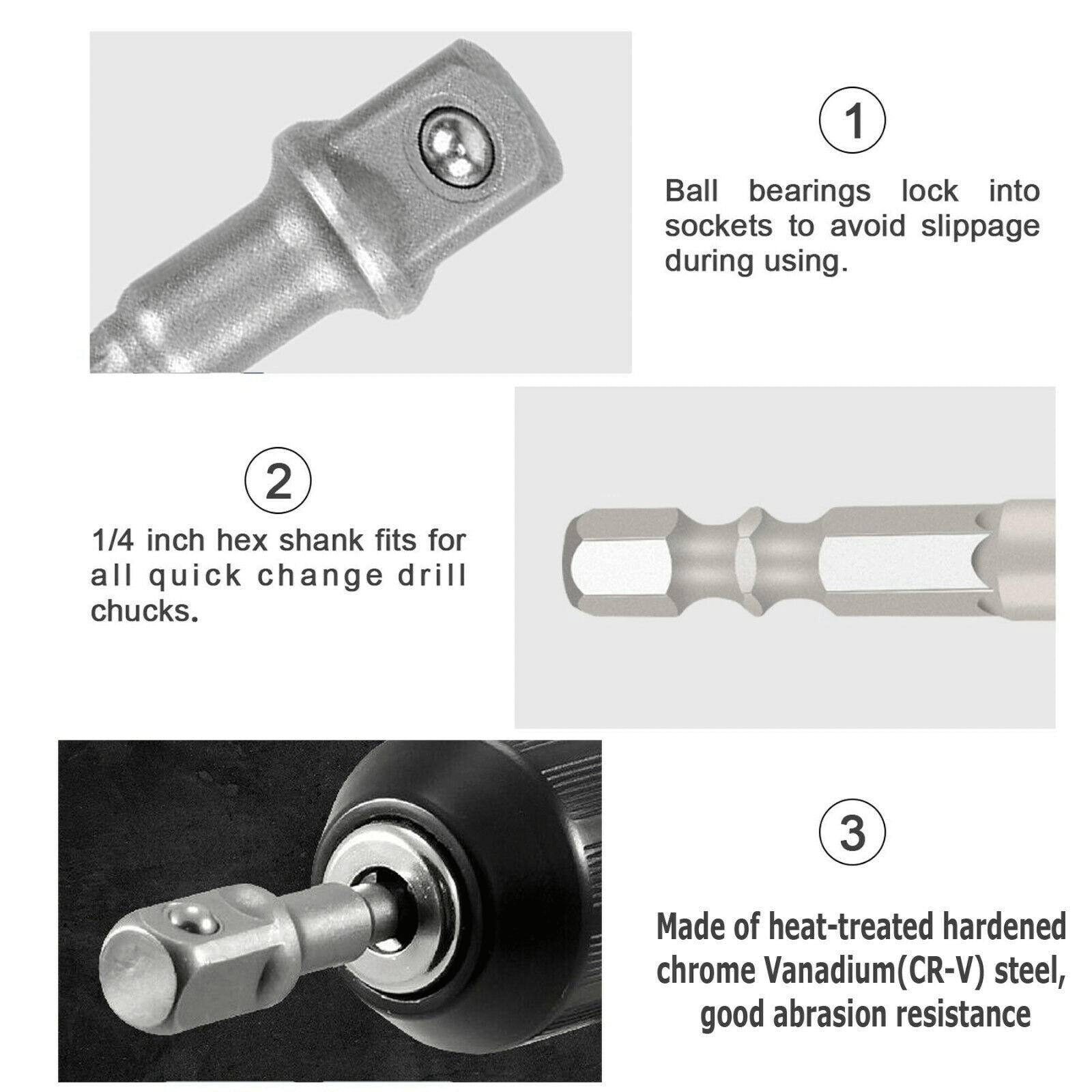 2. 3pcs in this package, 1/4" hex shank to 1/4" 3/8" 1/2" socket and 1/4 " shank can be converted to 1/4"  3/8" 1/2" square head.