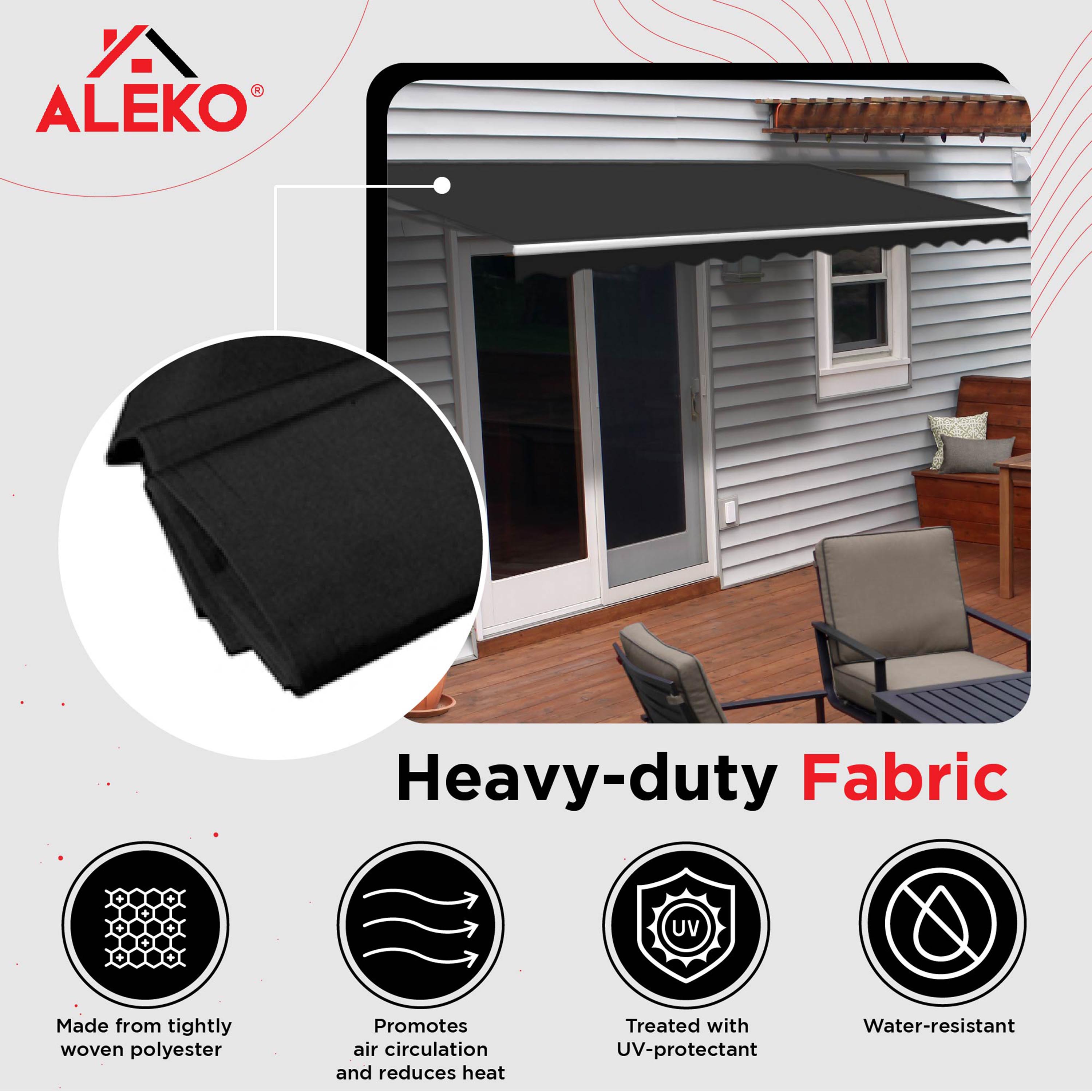 Description: Excellent awning fabrics offer endless possibilities for enhancing your home's beauty and decor. Awning fabrics add shape, dimension, color, and can fit almost any home's unique character and style. Your deck will be shaded from the hot sun rays and, depending on the awning fabrics, can provide outdoor protection for your entire family on a rainy day. Awning fabric replacement for retractable Awnings is Compatible with almost all other awnings brands. This ALEKO awning replacement fabric is a soft, breathable solution that is UV, water and mildew resistant and does not noticeably shrink or stretch. Really fast and easy to replace with your old awning fabric. Specification: Ideal fabric replacement for ALEKO 12x10 Feet Retractable Awning Compatible with almost all other awnings brands of this size Excellent sun and rain protection Strong, durable, and long lasting UV, water resistant material Actual Fabric Dimensions (LxW): 9.8 x 11 Feet Includes: (1) Awning Fabric, (1) Fabric Cord, and (1) Manual Material: Polyester Color: Black