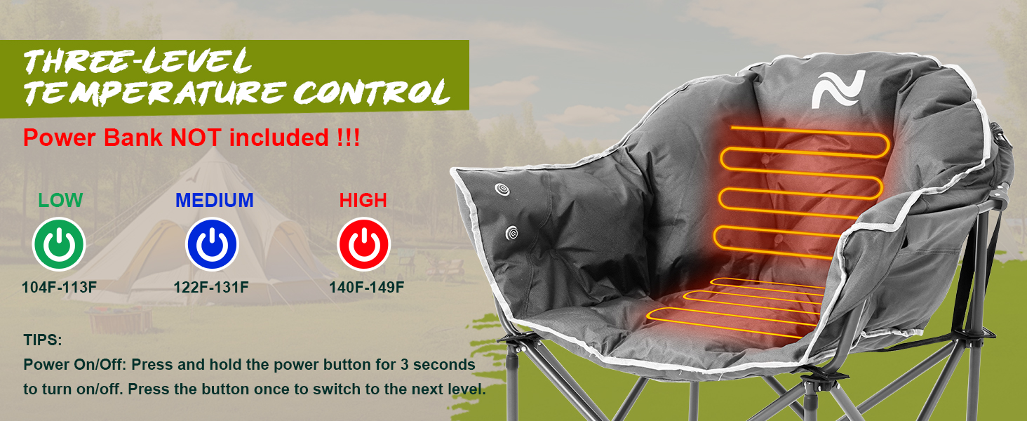 【HEATED CAMPING CHAIR】The Heated Camping Chair three when the temperature is adjustable, high, medium and low. Can be heated with any USB battery pack (batteries not included), providing you with ultimate warmth and comfort even in the cold winter. Suitable for camping, fishing, sporting events, lawn, garden, patio, backyard, outdoor activities and more.