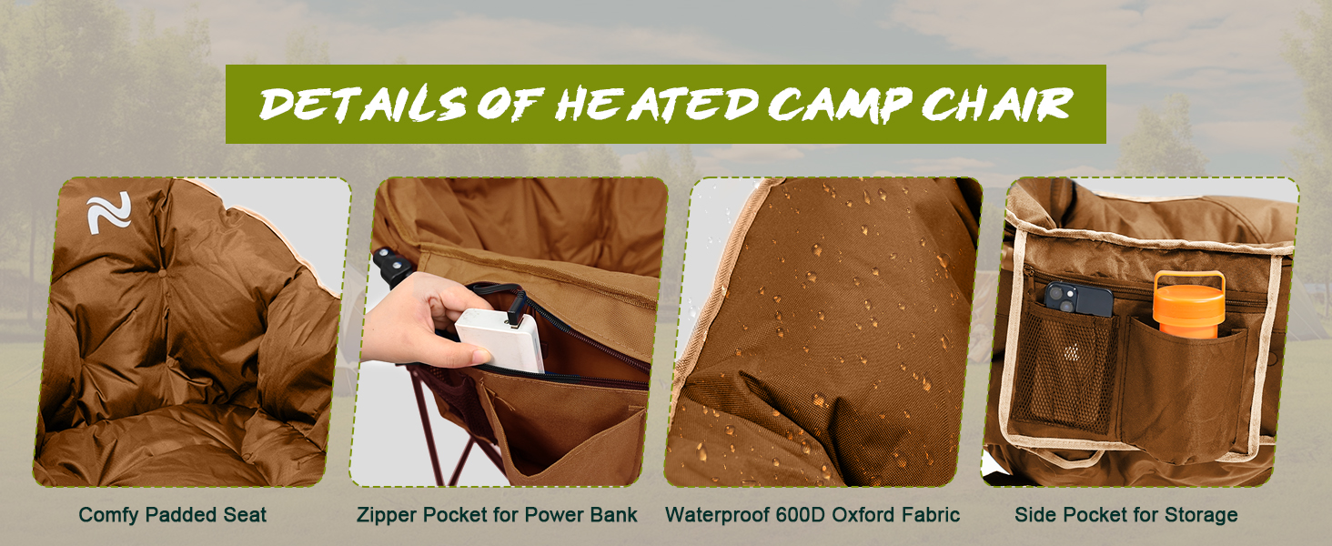 【Versatile Heated Seating】Compatible with any USB battery pack, this heated foldable chair provides portable warmth for all your adventures. Beyond camping, enjoy heated luxury on your patio, at picnics, sports events, and gatherings on the lawn.