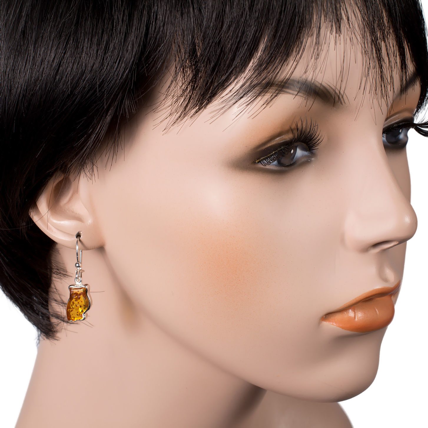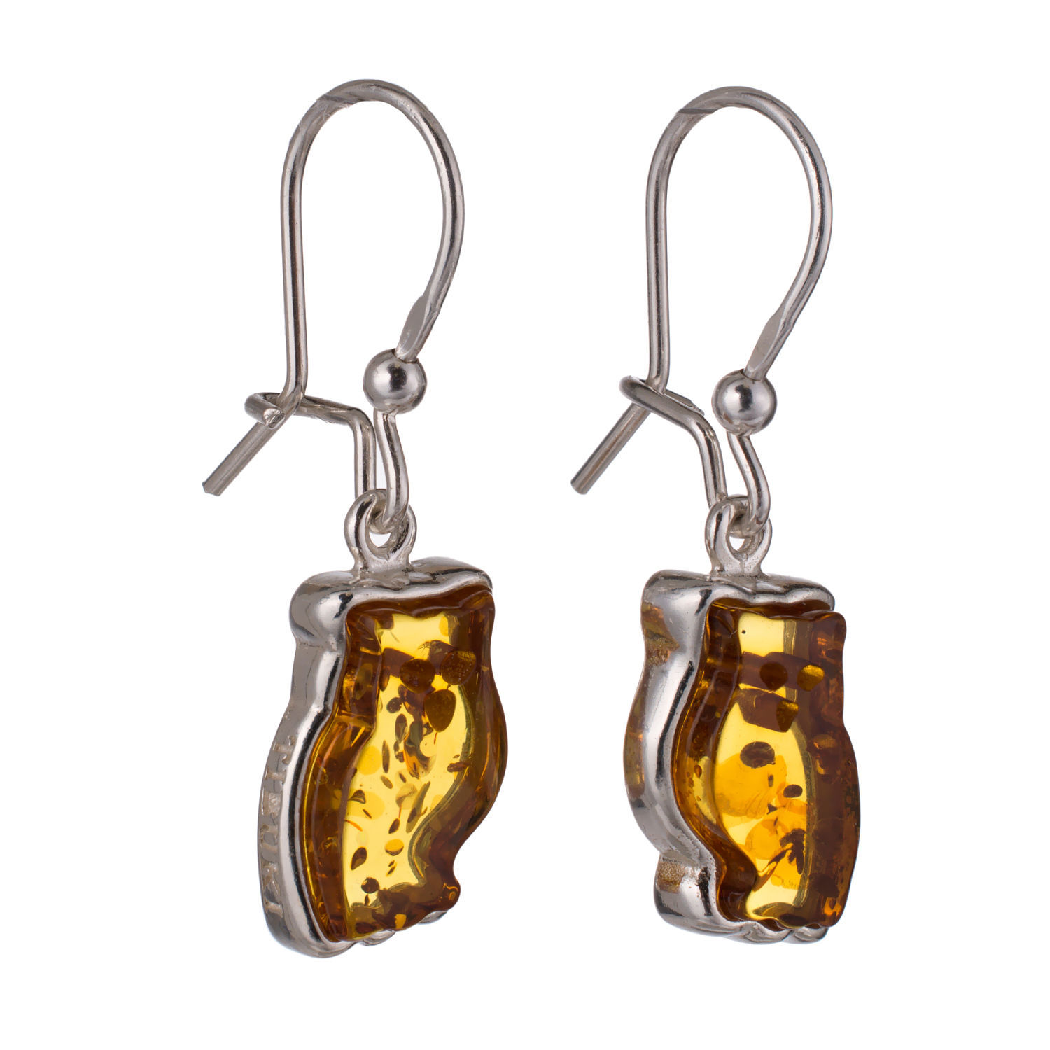 Owls have long been considered a symbol of wisdom and intelligence, making these sterling silver and Baltic amber kidney hook honey amber owl amber earrings a beautiful and meaningful gift. The amber earrings are handmade in Poland by skilled artisans, and each one is unique due to the natural variations in color, shape, and inclusion of the Baltic amber stones. The amber earrings measure 1.25" in length and 0.35" in width, with the honey amber stones spanning 0.5" x 0.3". They fasten securely with kidney hook closures and have a total weight of 3.43 grams. These dangling amber earrings can be worn as a set with a matching amber pendant (sold separately). Arriving in a soft blue drawstring pouch, these heirloom-quality amber earrings are perfect for presentation, gifting, and safekeeping. A certificate of authenticity is included. Since amber is an organic stone, there might be some slight variations in color, shape, and inclusions.