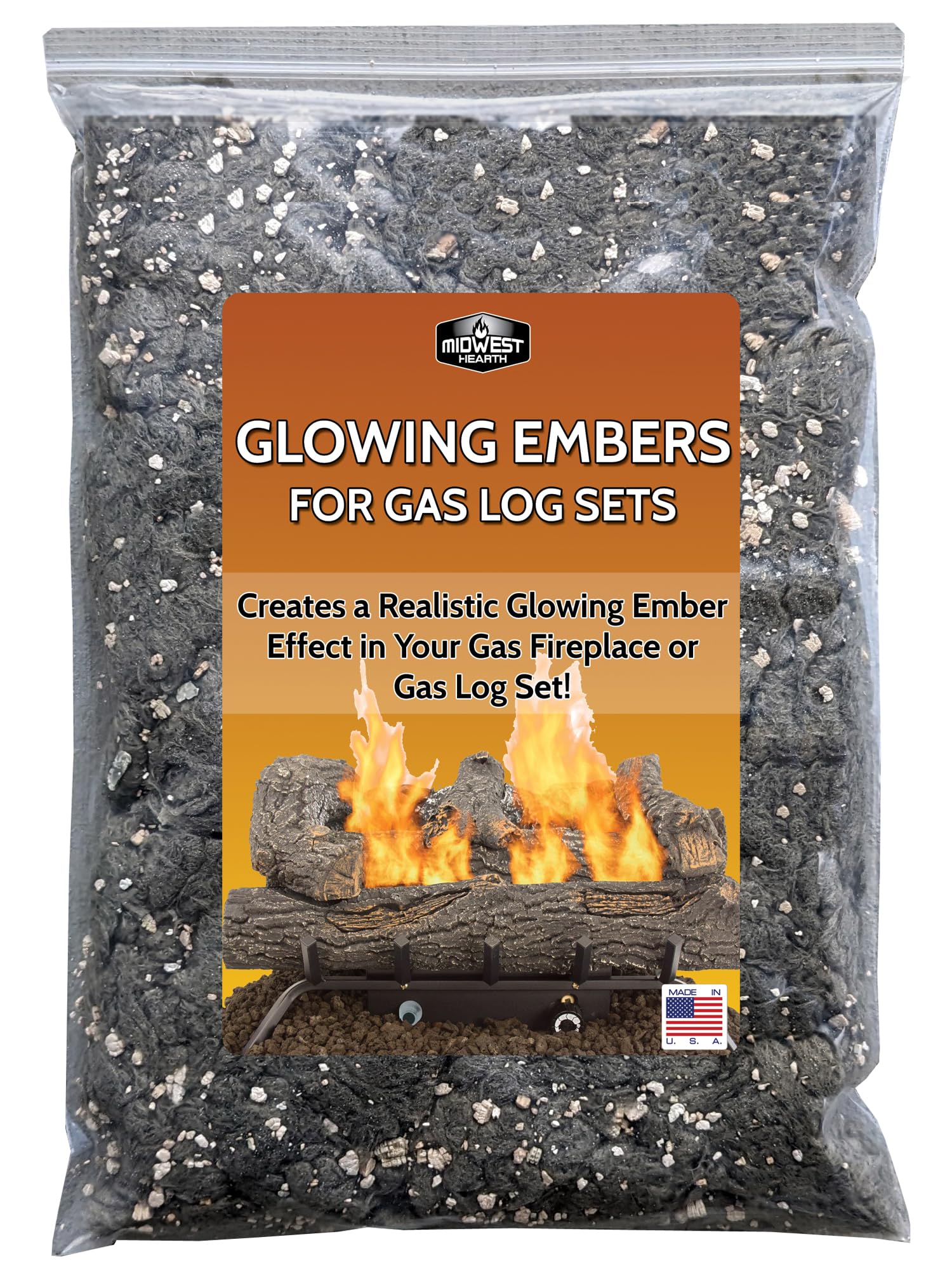 Replace your old glowing embers and spruce up that gas log set! Features: - Provides an amazing glow when added to a gas fireplace or gas log set. - Reflective mica flakes for added sparkle. - Creates realism to your fire. - Hides burner pan. - Can be used with lava rock for added realism. - Lasts for years. Compatibility: ✔ Vented Gas Fireplaces ✔ Vented Gas Log Sets ✔ Use approximately 1 bag for 18"-24" log set Installation: - Pinch small clumps and place near gas ports on burner pan. - Place small amounts on logs where the flames "lick" the logs for ember effects. - Many installers use a stiff bristle brush to "flick" a dusting of wool material on a log to add additional glowing effects where the flames touch. - Hint! You can lightly spritz a log with water to help the wool stick to the log in the area where the flame will touch. Quantity: - Comes in a generous 9" x 12" bag-full (approx 6-oz) that should be enough to dress up an entire fireplace.