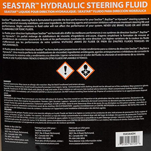 This hydraulic steering fluid is formulated to provide the best performance for your SeaStar / BayStar steering system. A perfect blend of viscosity stabilizers, anti-wear agents and corrosion inhibitors will ensure maximum steering life performance. Per manufacturer, for use on SeaStar, BayStar, and Hynautic steering systems.