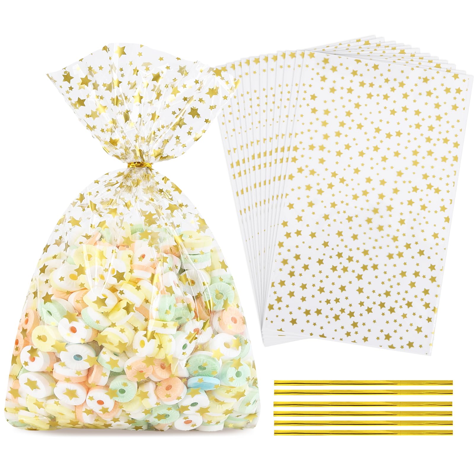 WHAT YOU GET: 100 pcs 8 x 12 Inch Gold Star Cellophane Bags and 100 pcs Silver Twist Tapes (4.7 Inch long), great decorative accessory for candies, parties, weddings, gift wrapping, crafts and more
