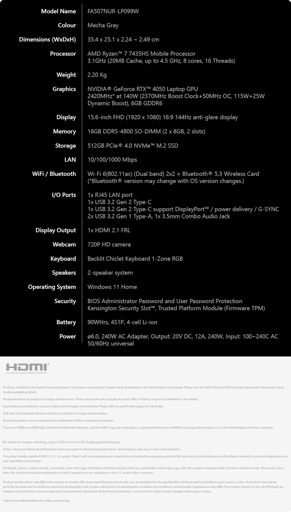 ASUS TUF Gaming A15 15.6" 144Hz AMD Ryzen 7 7435HS 16GB RAM GeForce RTX 4050 512GB SSD Win11 Home Laptop
