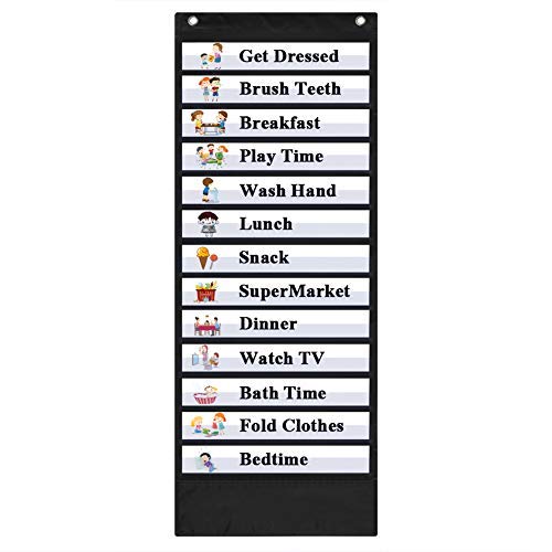 Educational Scheduling Pocket Chart Our Daily School Pocket Chart offers quality, economical teaching and education products. Quality polyester chart with see-through pockets makes it easy to organize the day's activities. This display chart comes with 18 double-side blank schedule cards ready to be filled in by you and a convenience card. Makes it fun and easy to keep organized and allows an easy way for students to keep track of their daily schedule. Good Size Chart for Daily Routines ⦁ Durable polyester pocket chart with see-through pockets. ⦁ Visual schedule for home: 13 x 35.5 inch. ⦁ Features 13 Visual Slots (1.8" depth) & 1 Pocket-Black & 18 Scheduling cards. ⦁ Dry Erase Cards size:12 inches x 2 inches ⦁ Heavy-duty metal grommets for hanging. ⦁ 2 Free hangers fits most common household doors. ⦁ Makes it fun and easy for students to learn their schedule. ⦁ Display your daily classroom schedule while teaching time management. ⦁ Ideal for various educational settings liks preschool, kindergarten, elementary school etc. Warm Tip ⦁ Package Content: 1 x daily schedule pocket chart & 18 Blank schedule cards. ⦁ With the difference in the measurement method, please allow 1-3 cm in size deviation. ⦁ Due to take in light and the monitor, the actual color may have a slight difference.