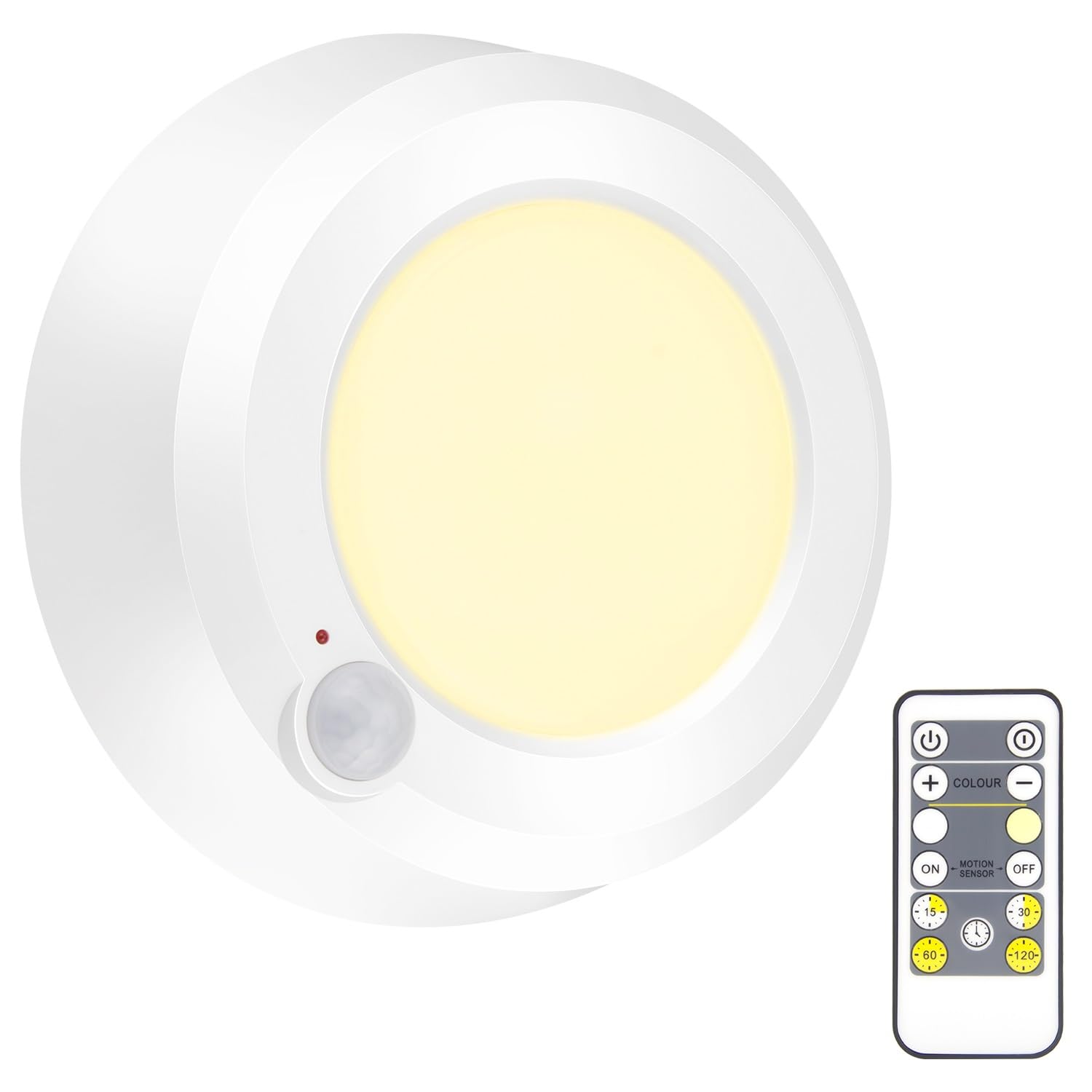 【CORDLESS MOTION SENSOR CEILING LIGHT】—The Motion Detector Distance is 18 feet . Turn ON Motion Sensor function by remote when use Motion detector. Please Press the key "M/ON" to open, and "M/OFF" to close. The red indicator light will flash when the Motion Sensor is on working. (Light will turn ON automatically just in DARKNESS when detected the motion and auto OFF after 20 seconds without motion detected. )