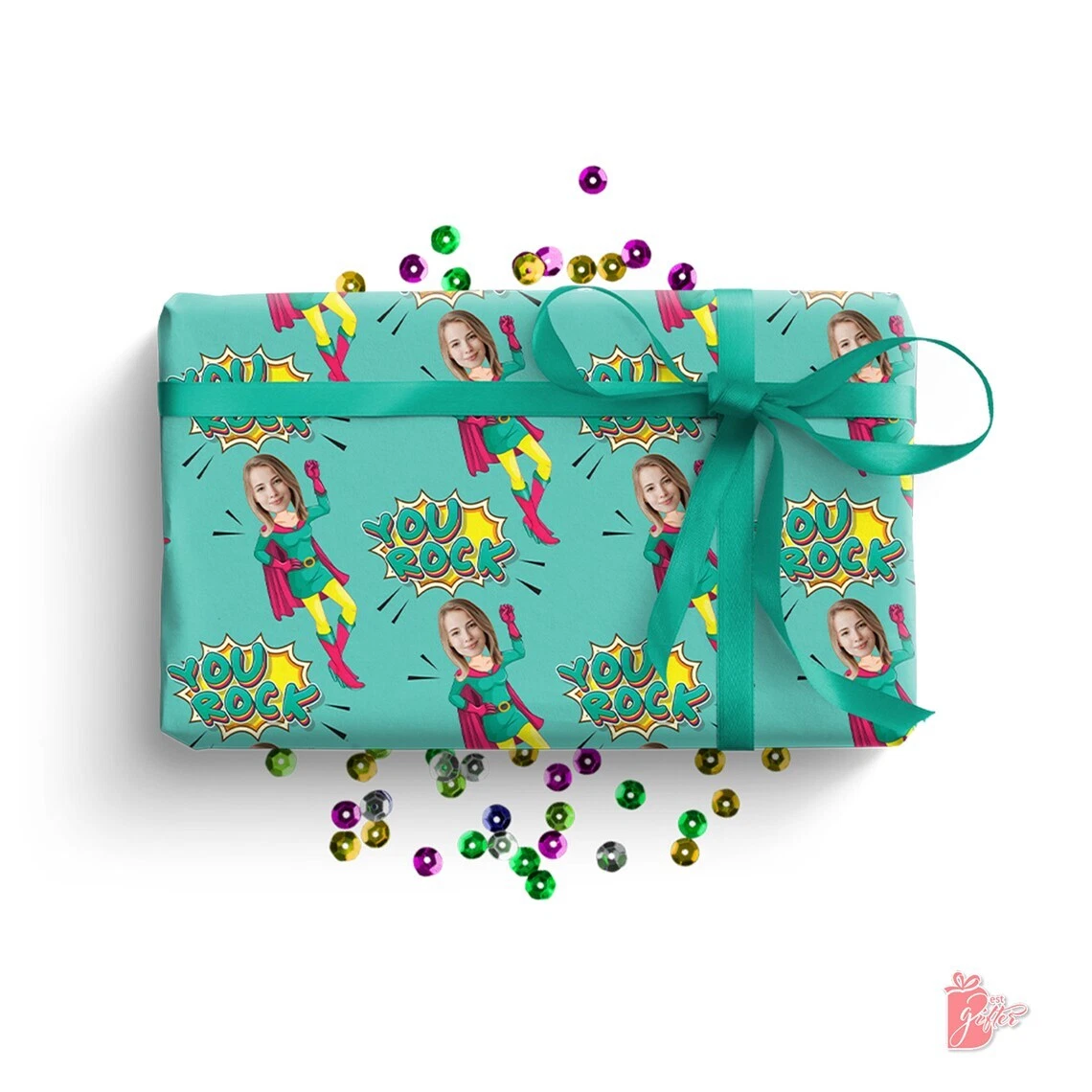 Personalized Birthday Gift Wrapping Paper w/ Photo Face Cut Girl Hero Gift Wrap