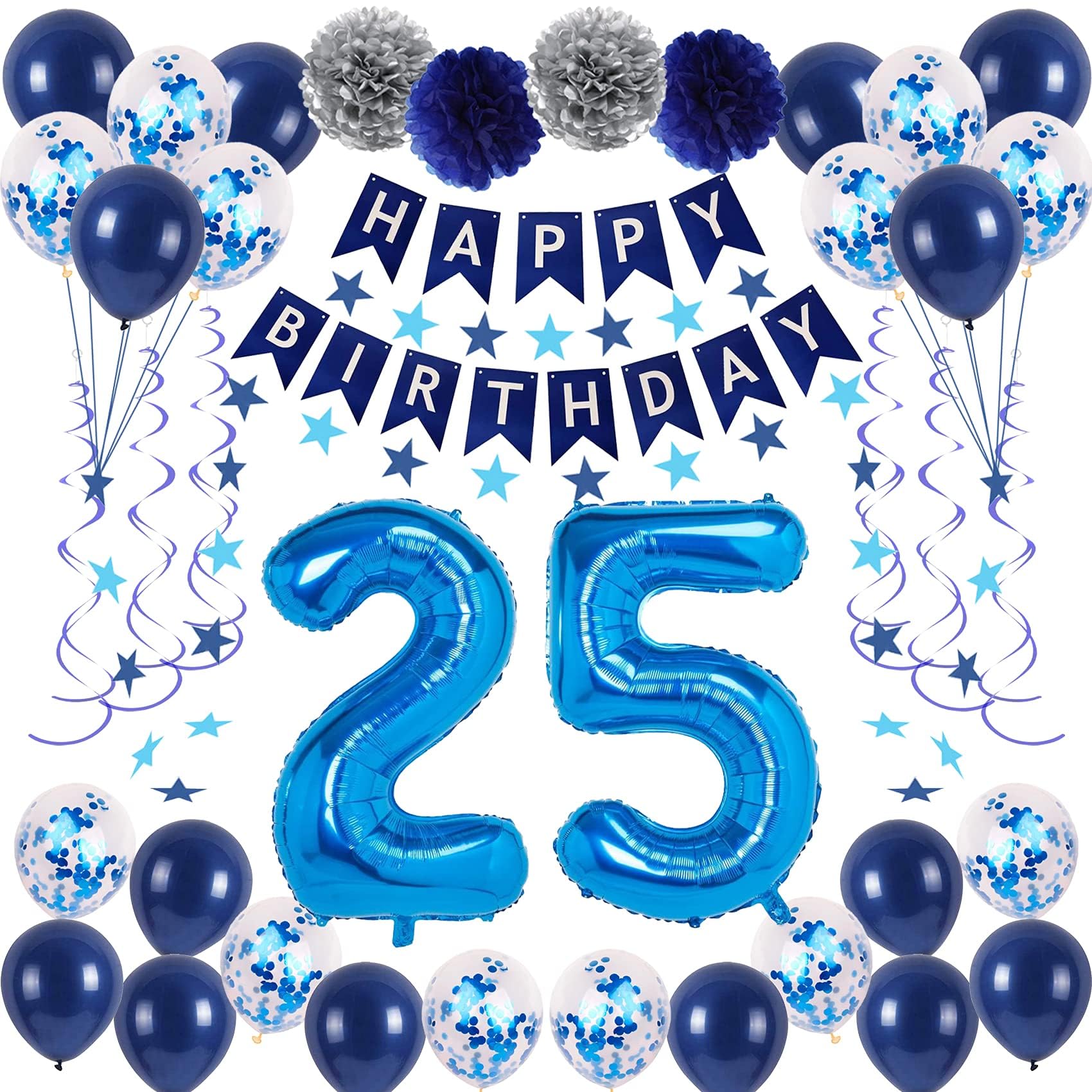 ►WHAT THIS KIT INCLUDES: This sweet 25th happy birthday party décor package includes ‘HAPPY BIRTHDAY’ banner*1 set, royal blue number 25 foil balloons*2, star streamers garland*1, blue hanging swirls*1 set, paper flowers (silver*2, blue*2), navy blue latex balloons *14, confetti balloons*12, which will meet all your needs